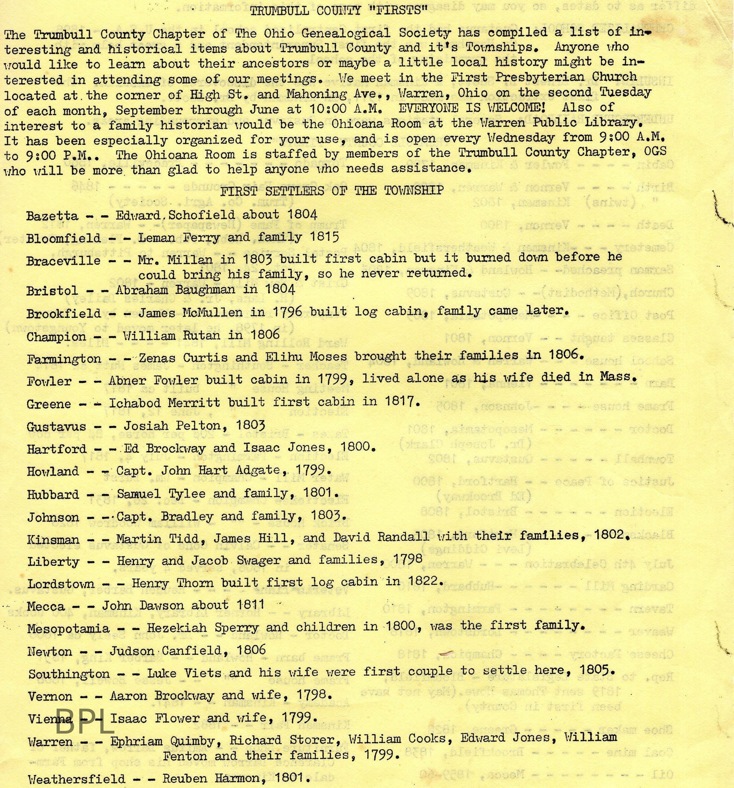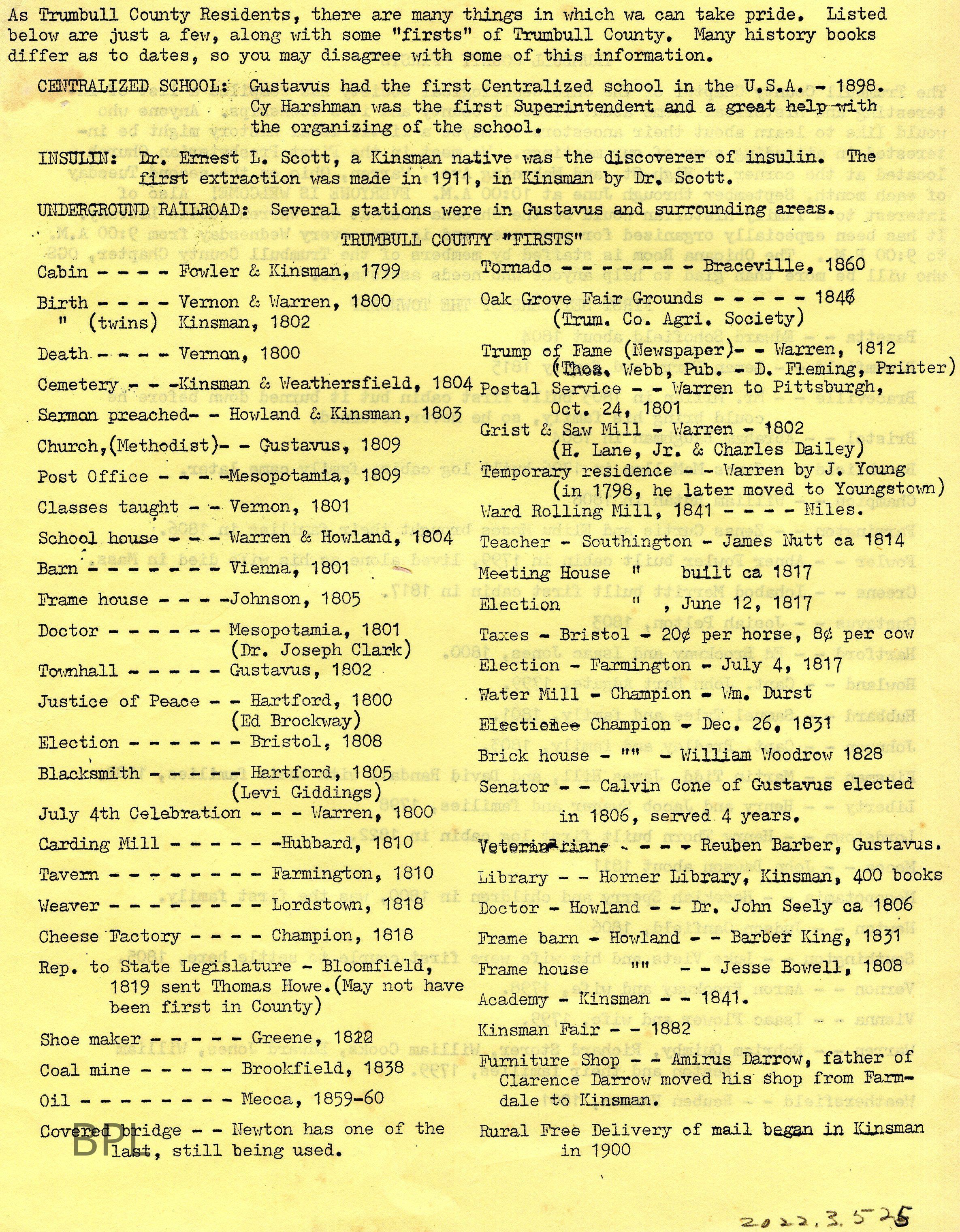 Typed History of Trumbull County "Firsts"Cataloged By
