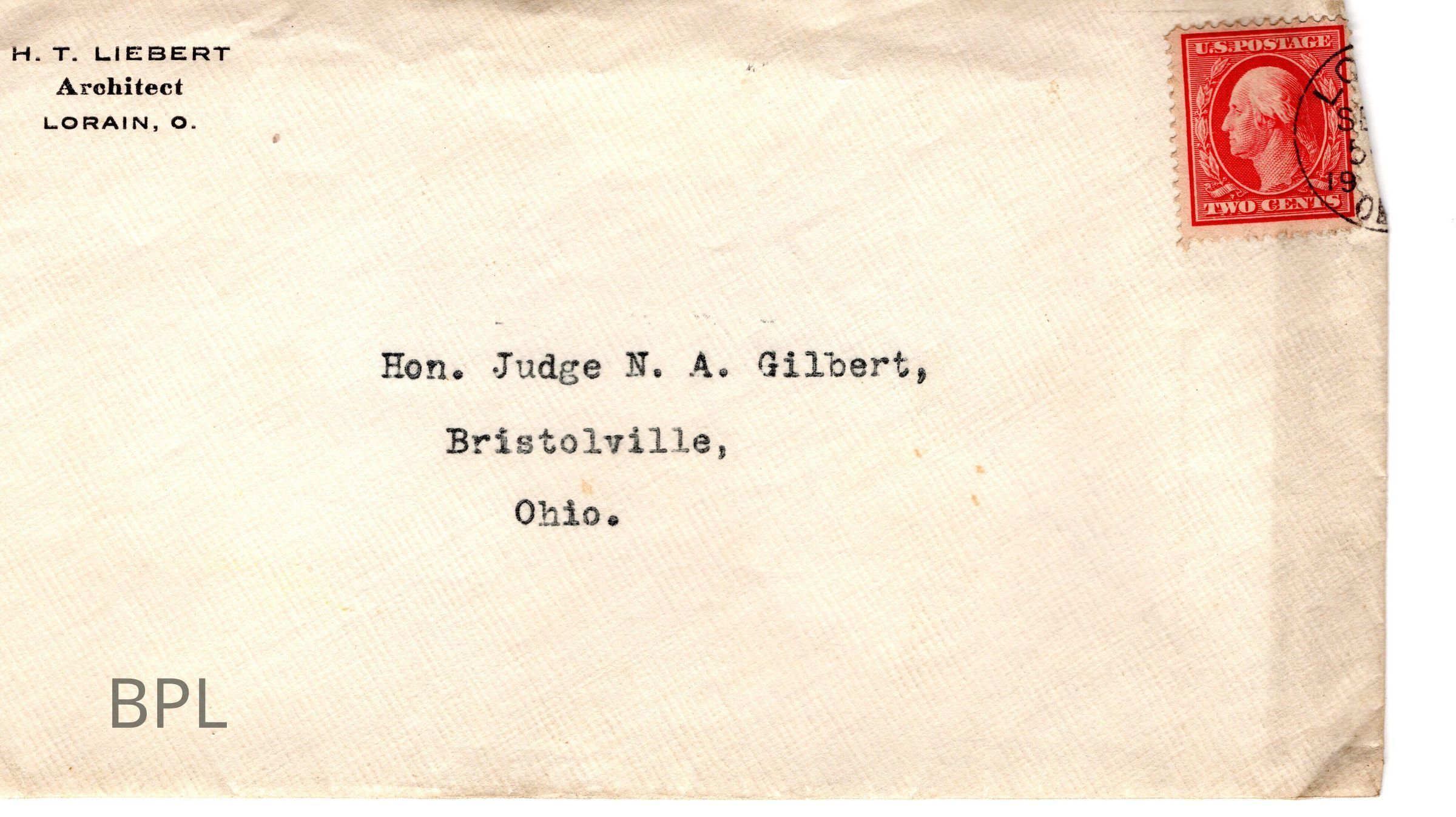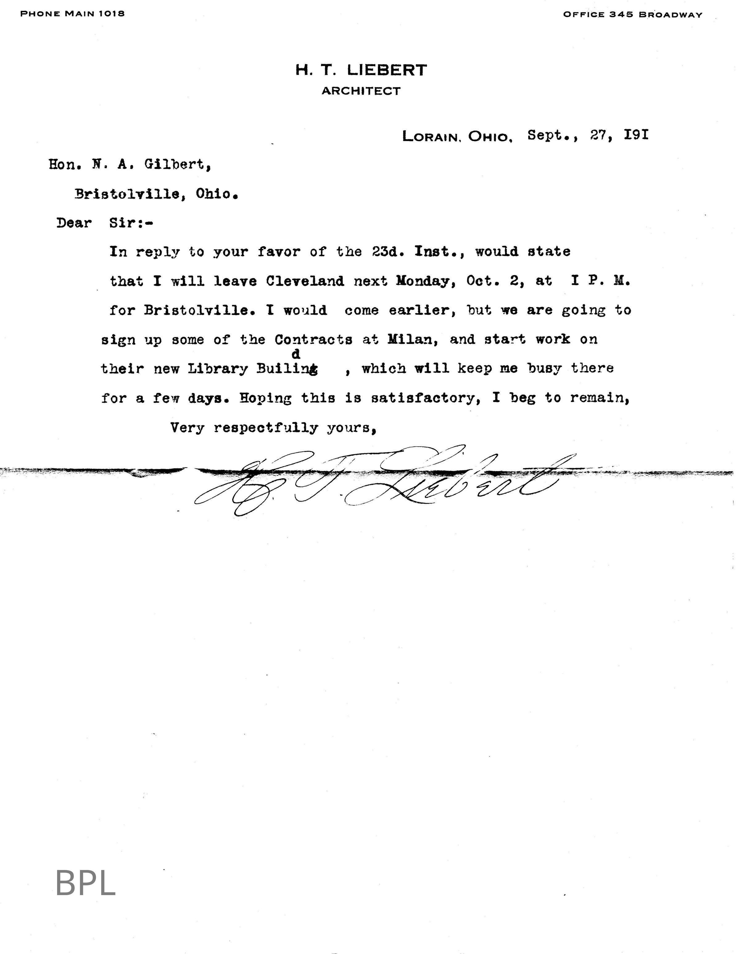 Letter to Judge N.A.Gilbert from H. T Leibert, architect, that he will be in Bristolville, Ohio on Oct.2, 1911. September 8, 1911Cataloged By