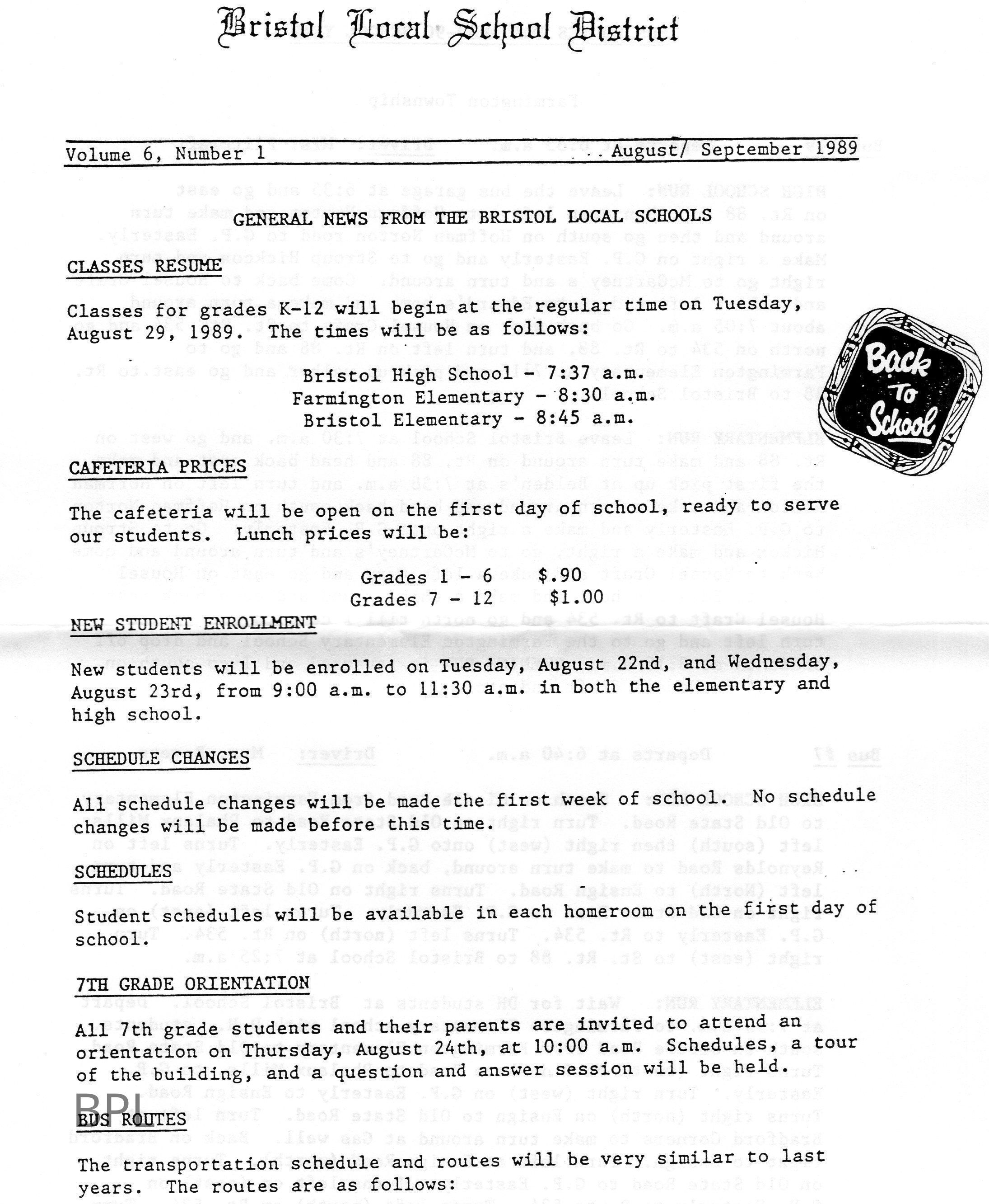 Bristol School Report October/November 1989. Included Sports ScheduleCataloged By