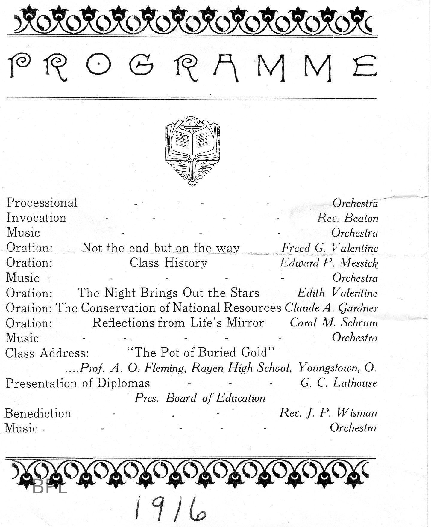 Program from 1916, probably from a Bristol School event. Rev. J.P. Wisman was a Pastor of Bristolville Episcopal Church in 1915. Esward P. Messick was born in 1897 and would have graduated about 1916, he gave the Class History.