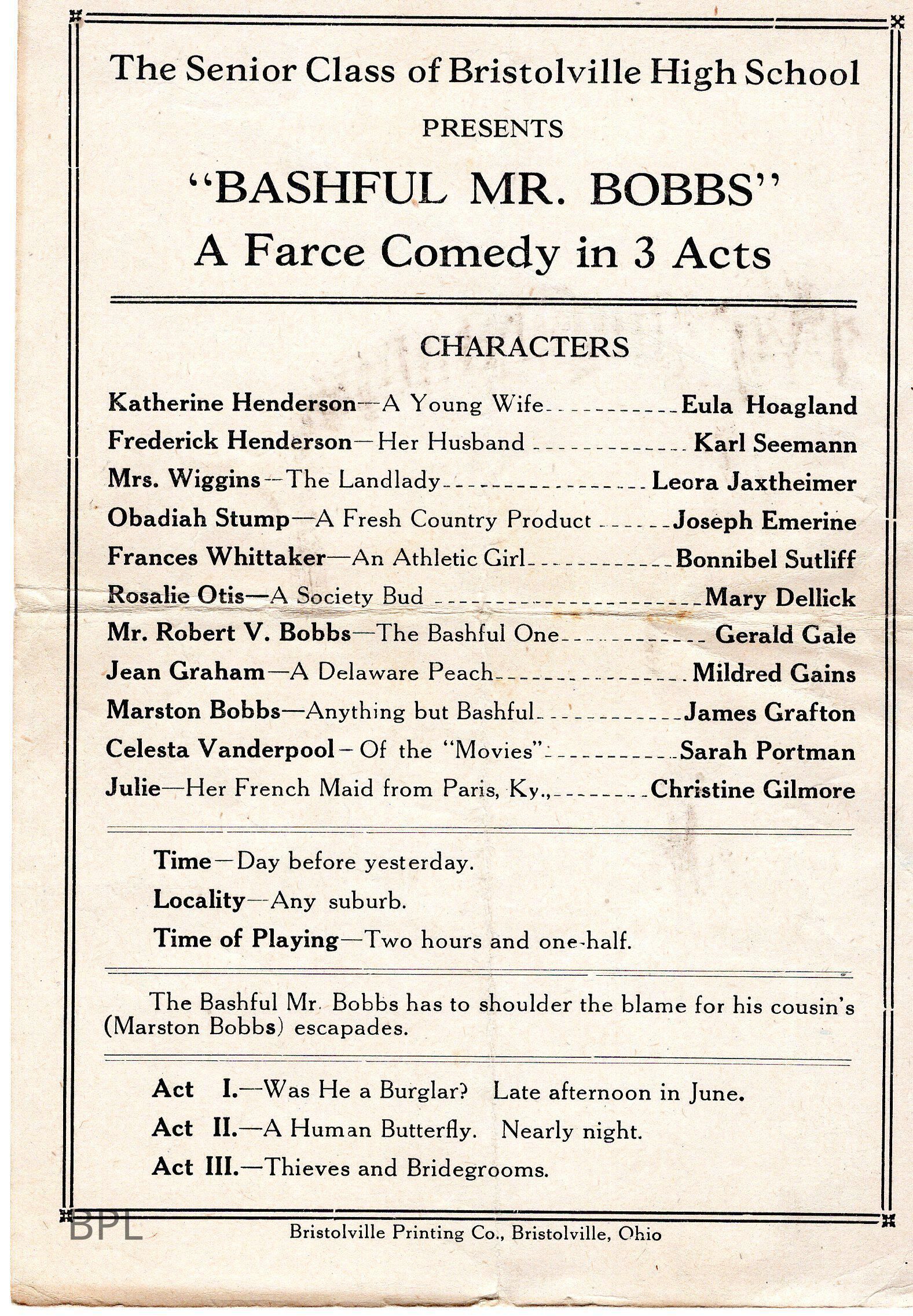 Program of class play" Bashful Mr. Bobbs, a Farce Comedy in 3 Acts, late 1920's.