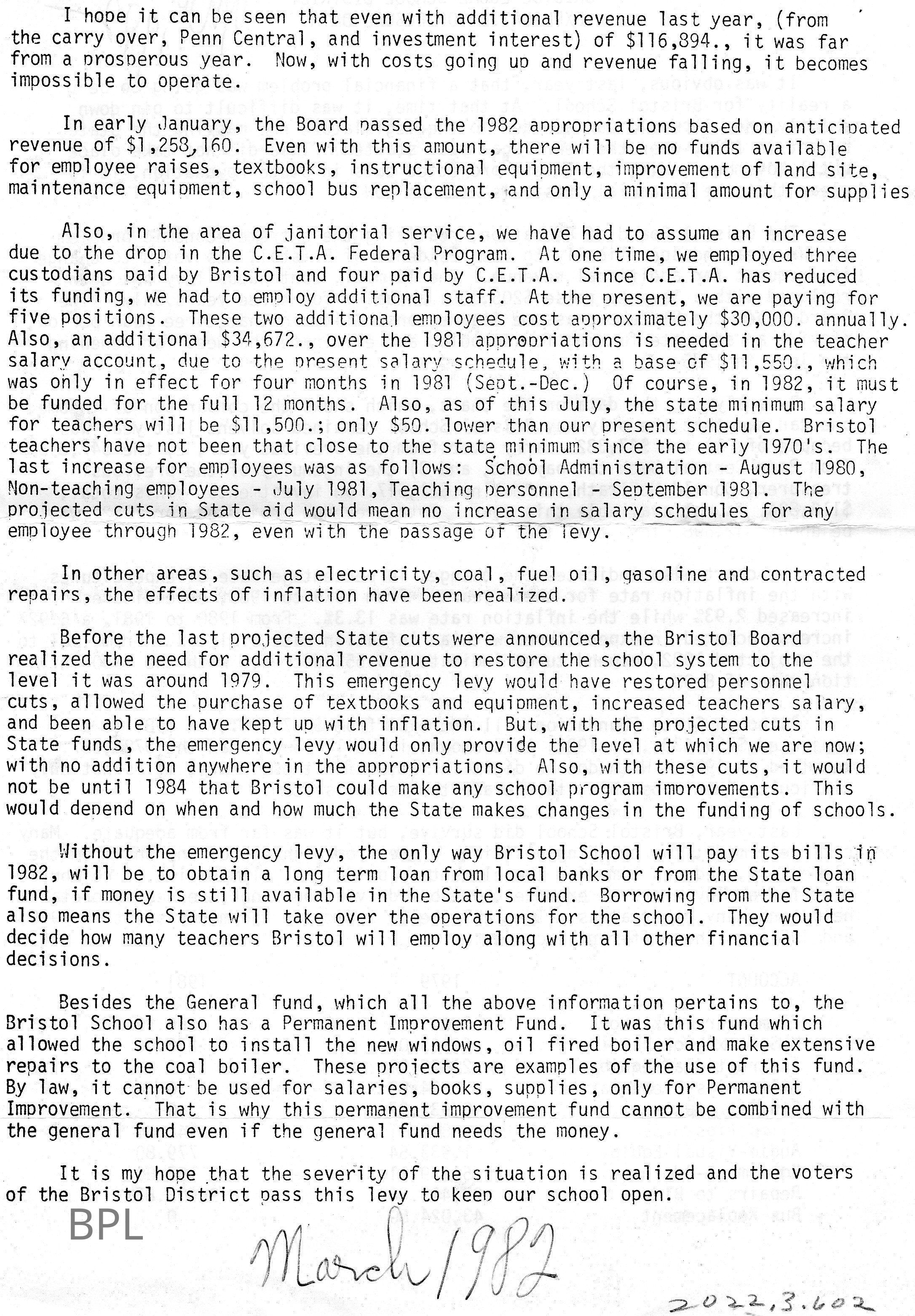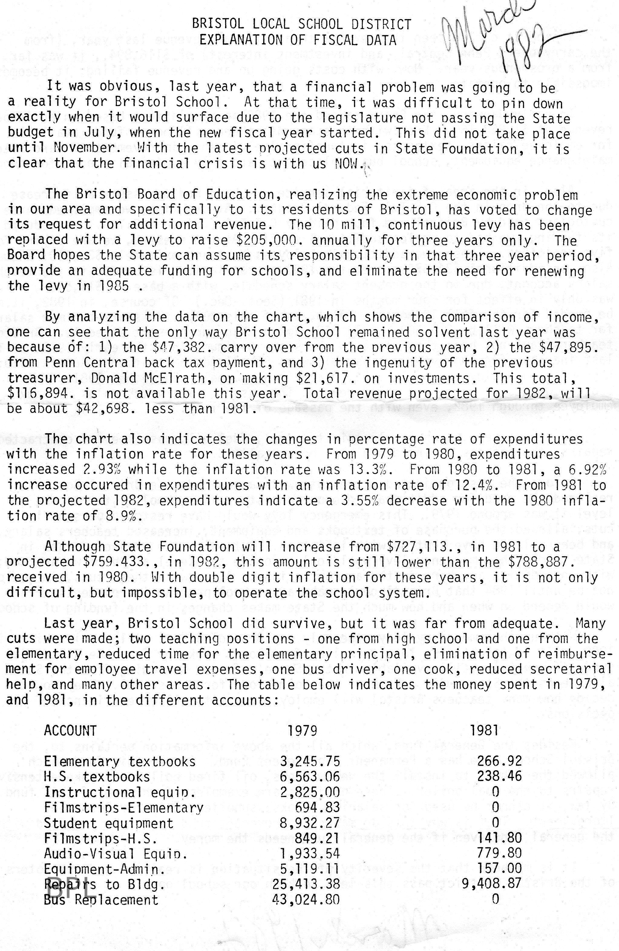 Fiscal Report of Bristol School, March 1982Cataloged By