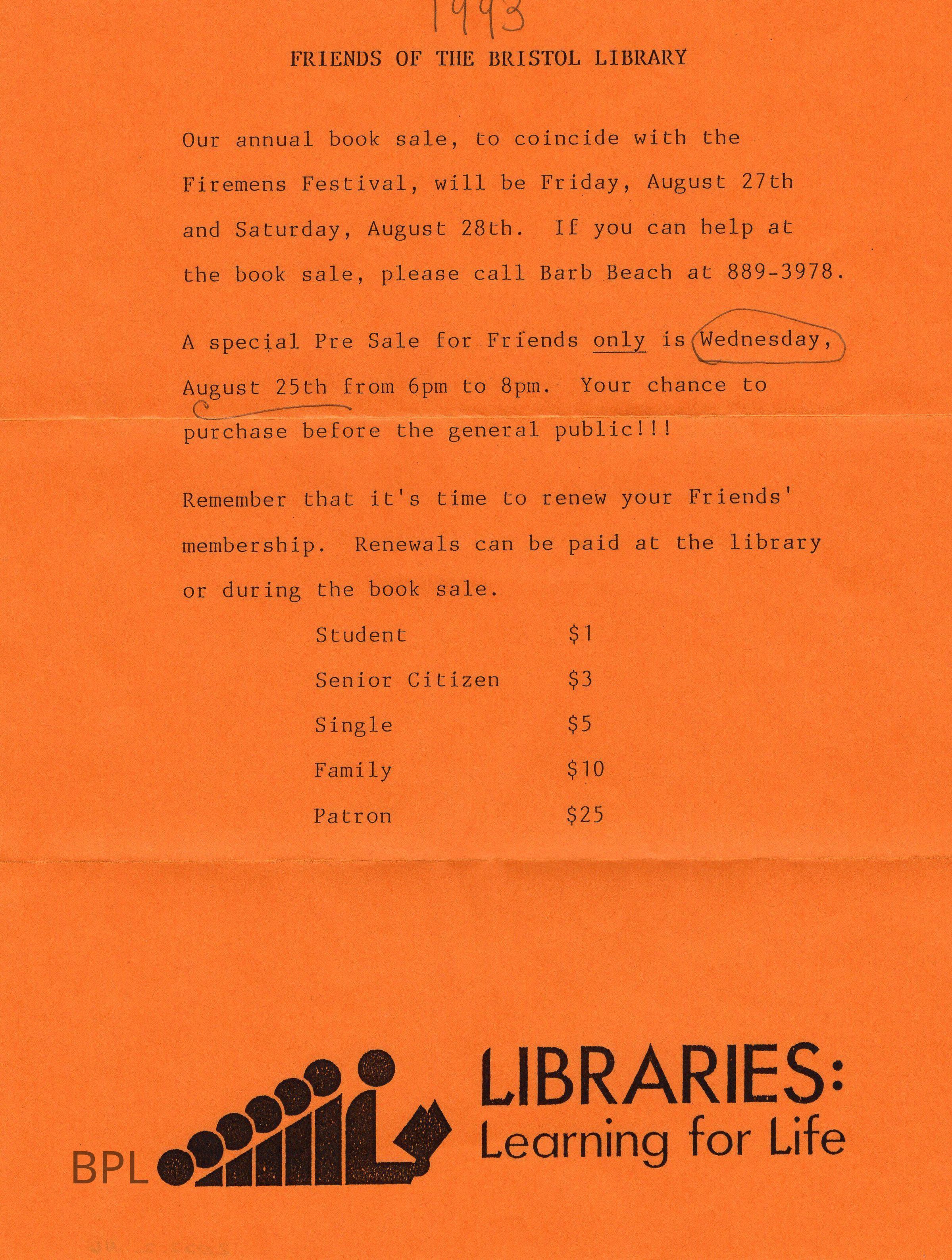 Friends of Bristol Public Library notice of annual book sale.Cataloged By