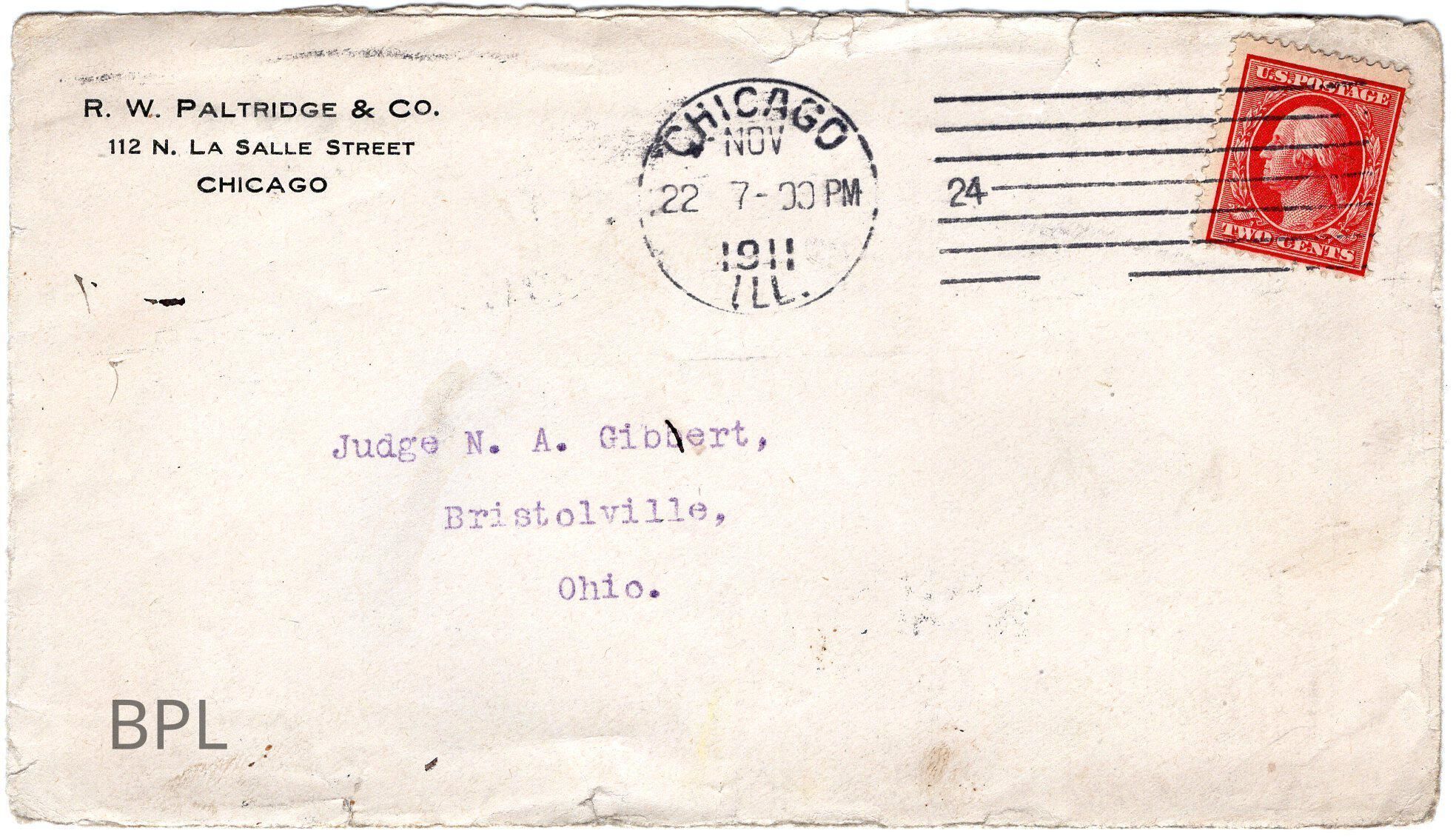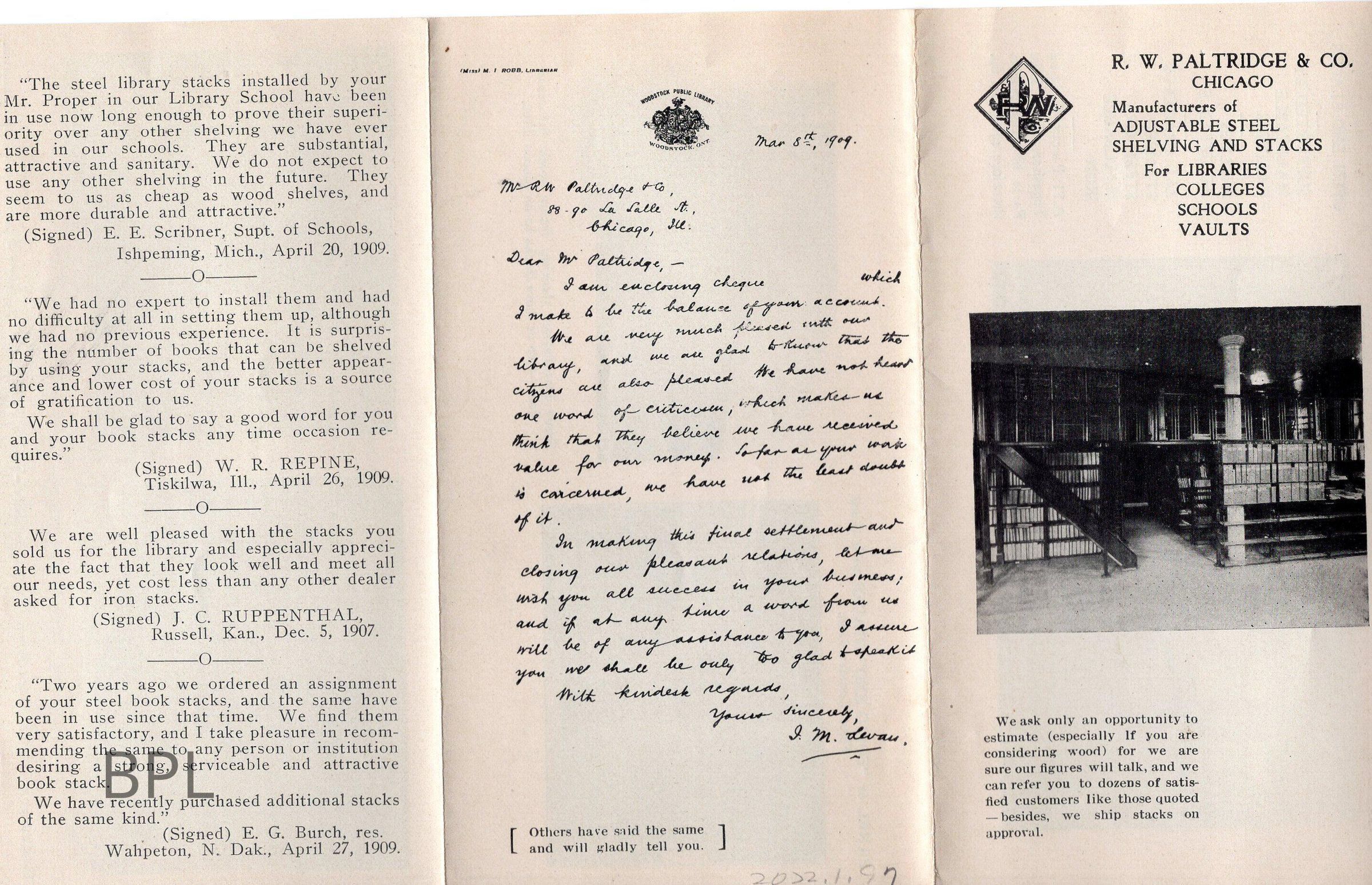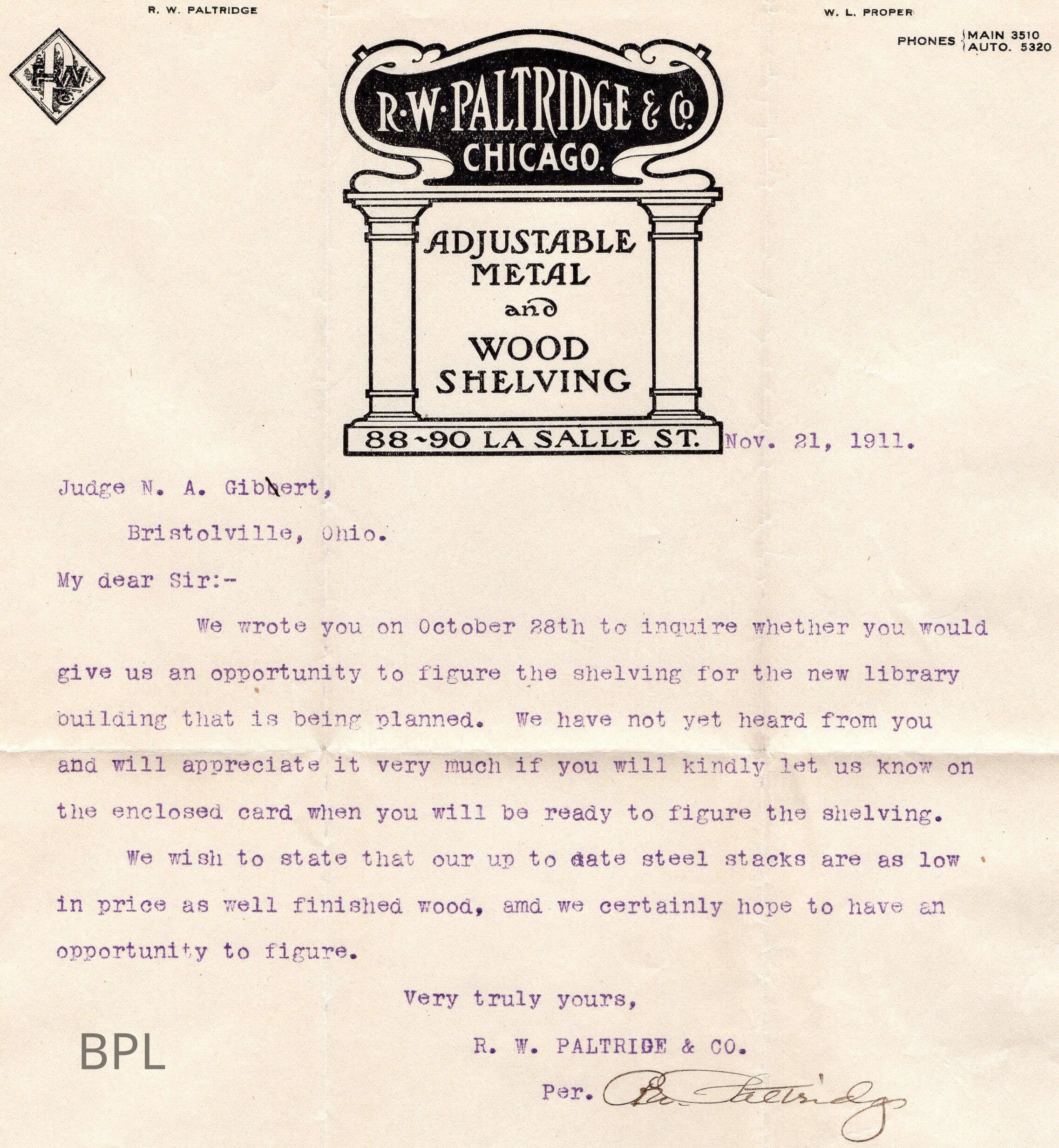 Envelope, letter and advertisement to Judge Gilbert from R.W. Palrtidege &Company of Chicago, Illinois of November 21, 1911, for sale of steel and wood shelving for the library.Cataloged By
