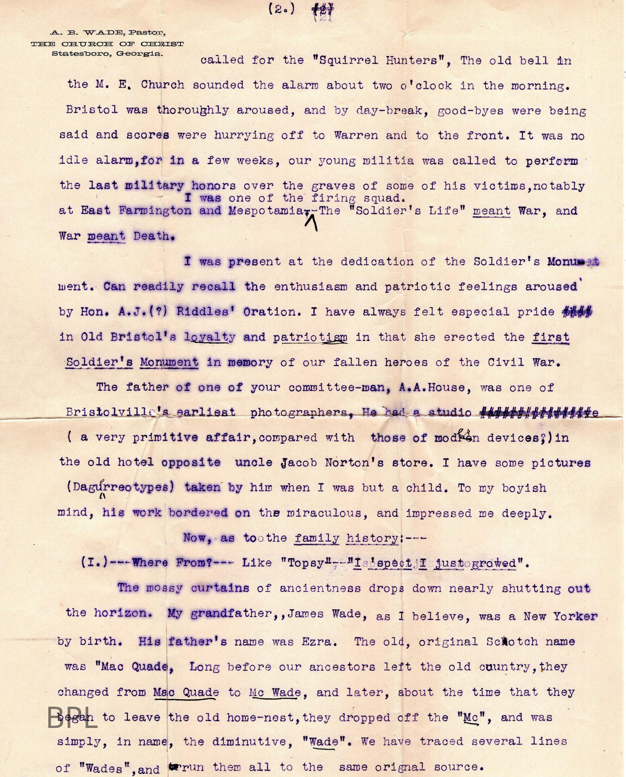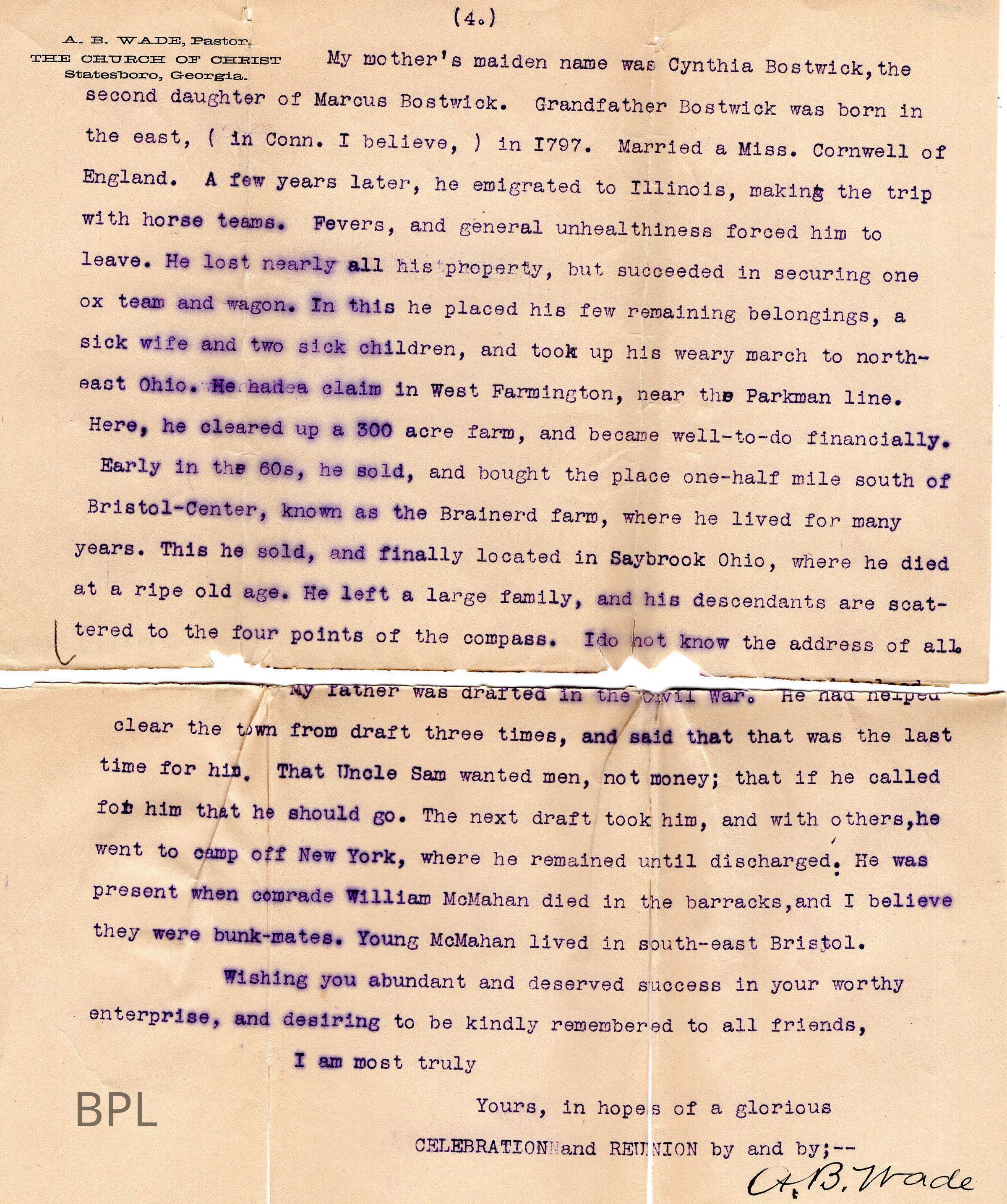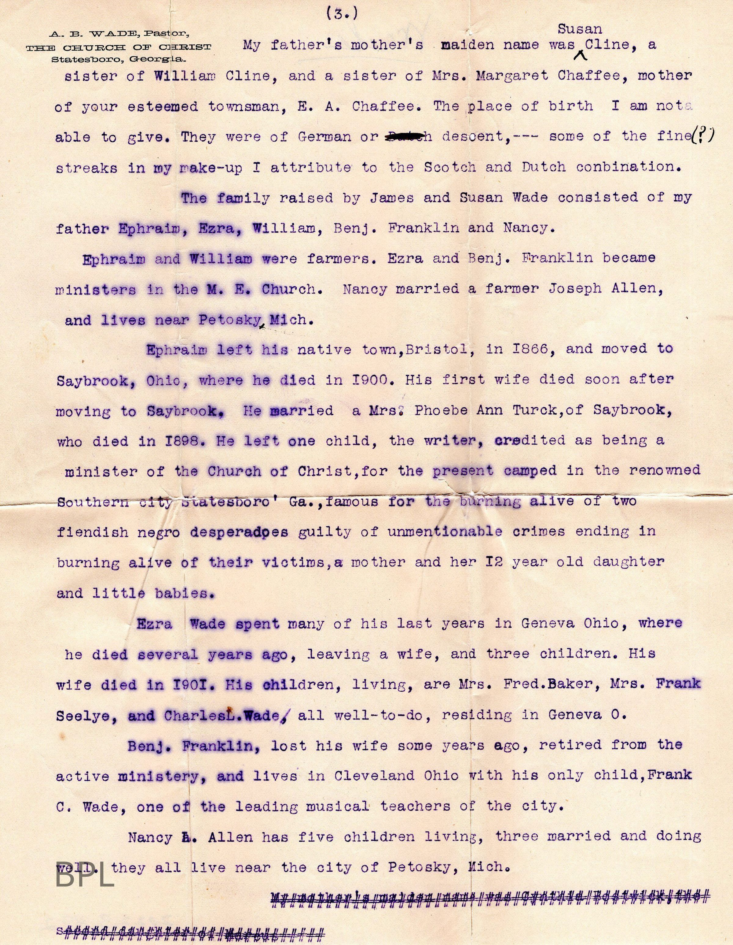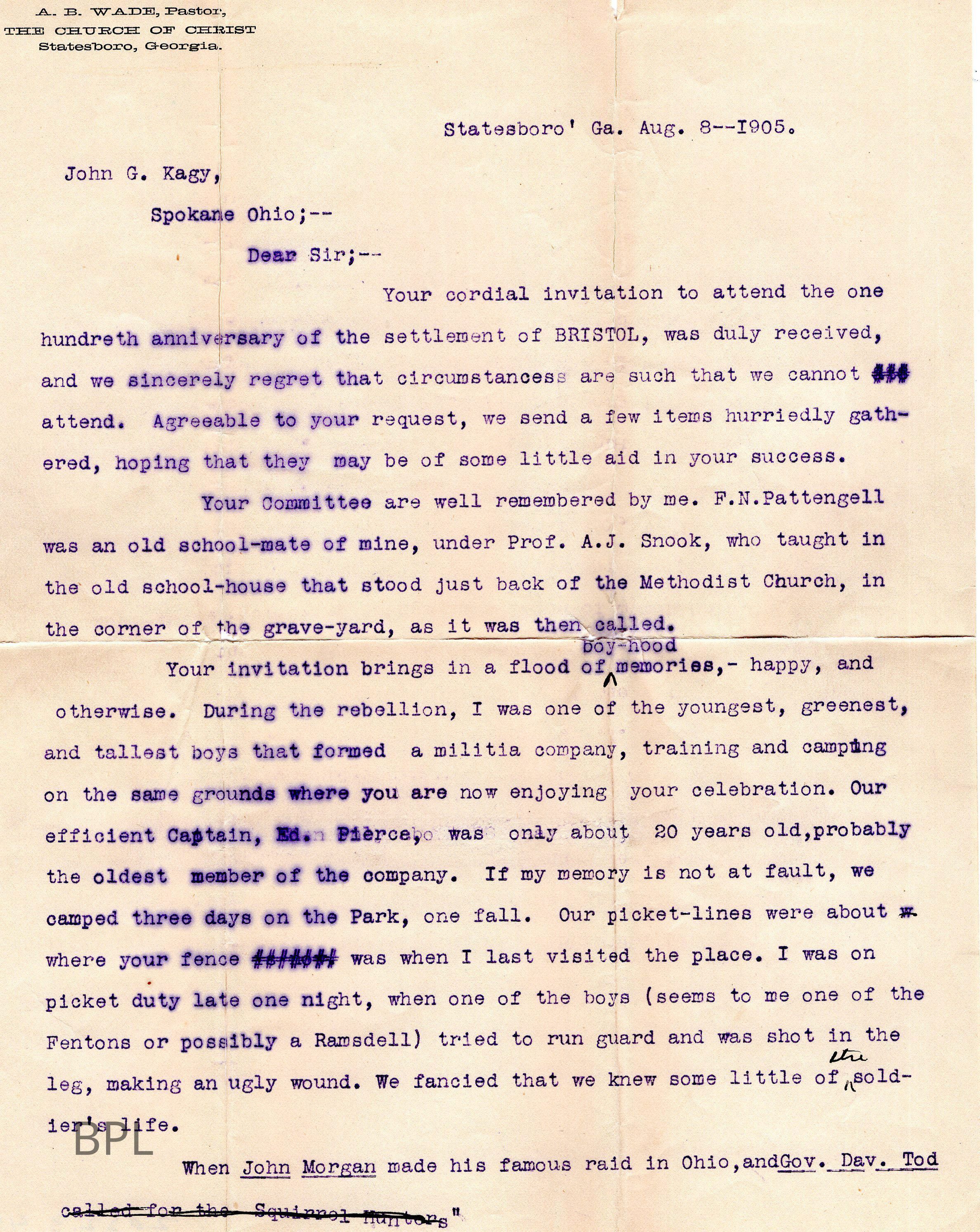 Letter to John Kagy from A. B. Wade regarding Wade(Mc Wade) Family History, August 8, 1905Cataloged By