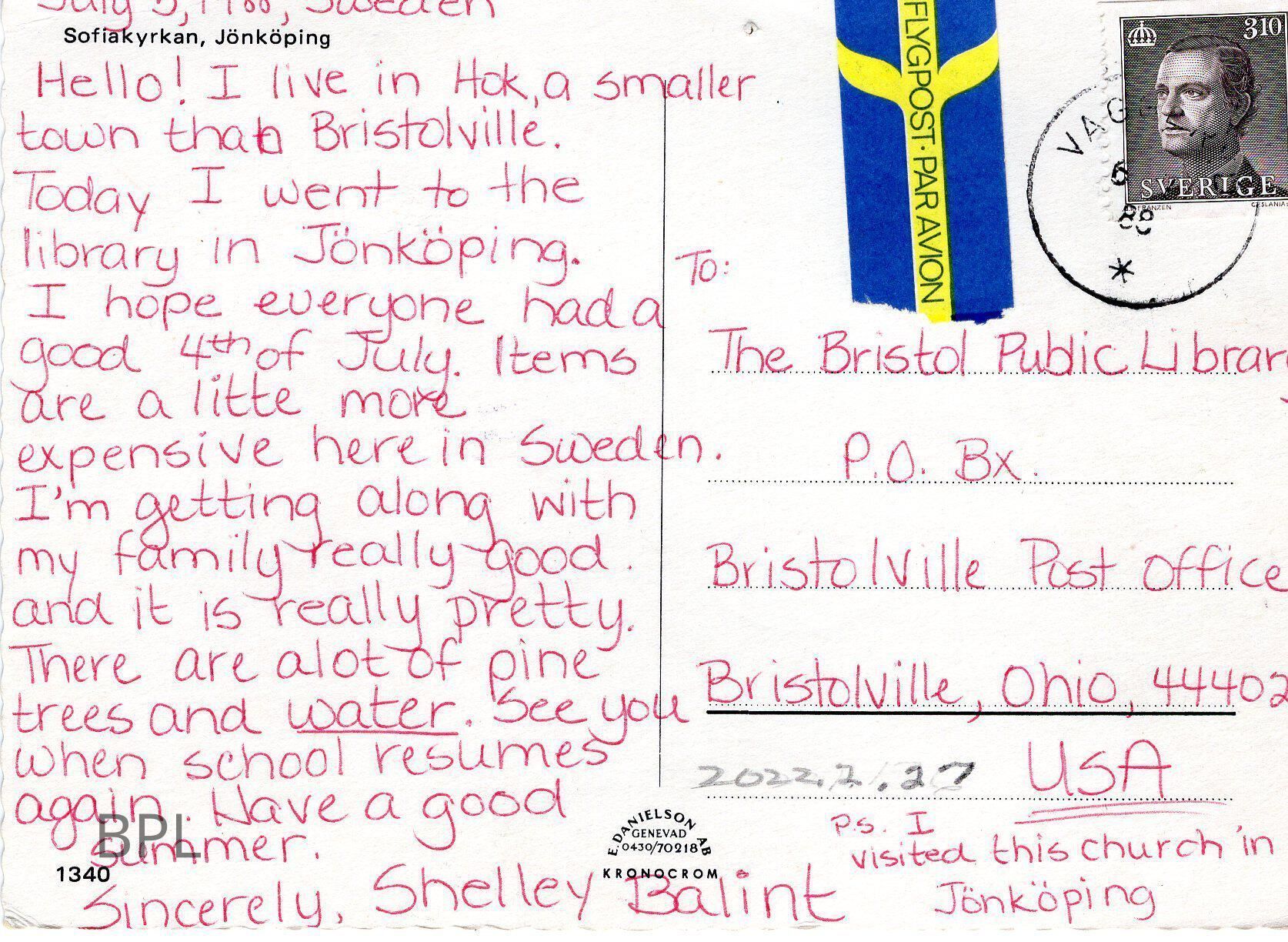Postcard to Bristol Public Library from Shelley Balint from SwedenCataloged By