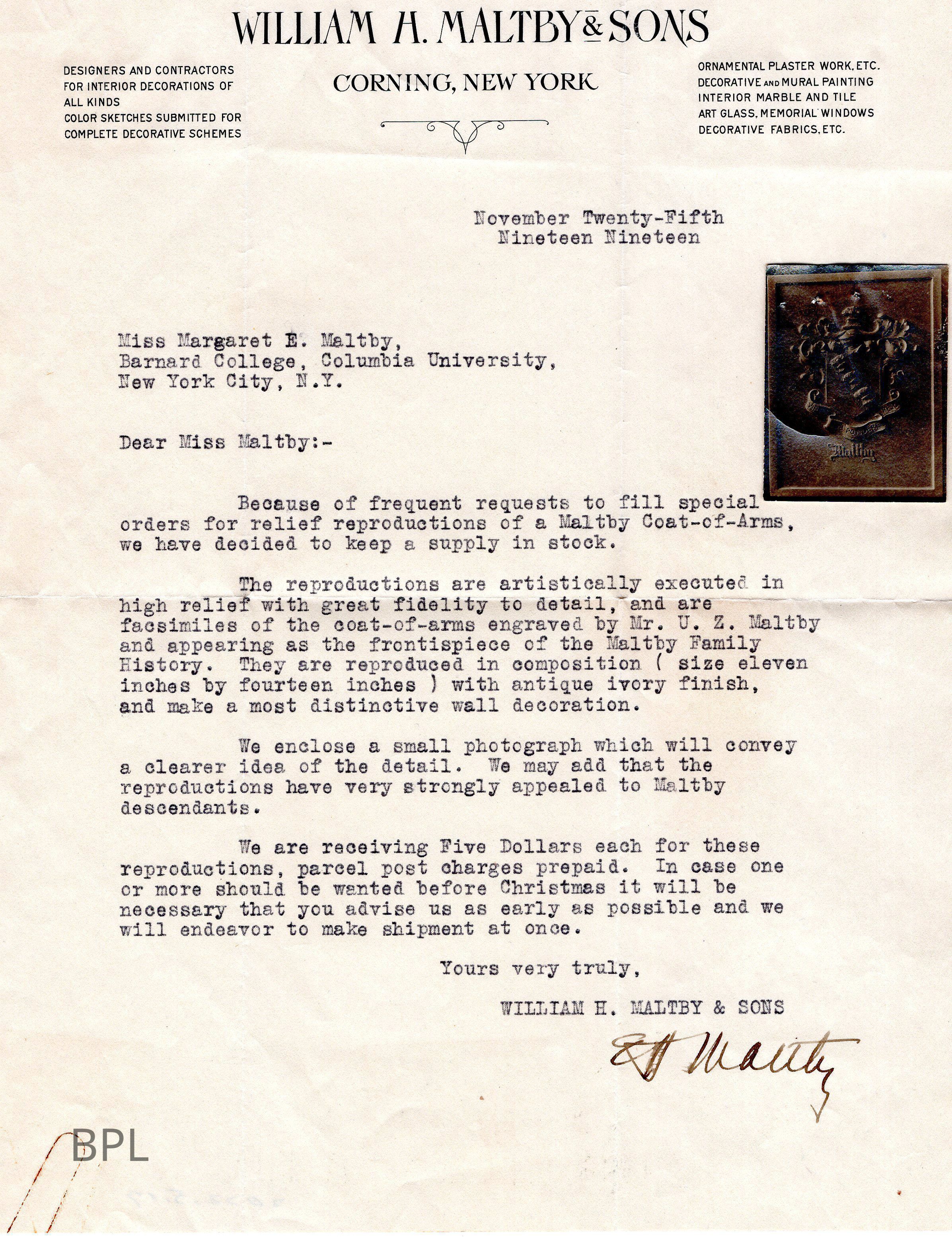 Letter, November 25, 1915, from William H. Maltby & Sons of Corning, New Youk to Margaret E. Maltby. A Small Reproduction of the Maltby Coat of Arms is enclosed. Note Coat of Arms is at the top Left of LetterCataloged By