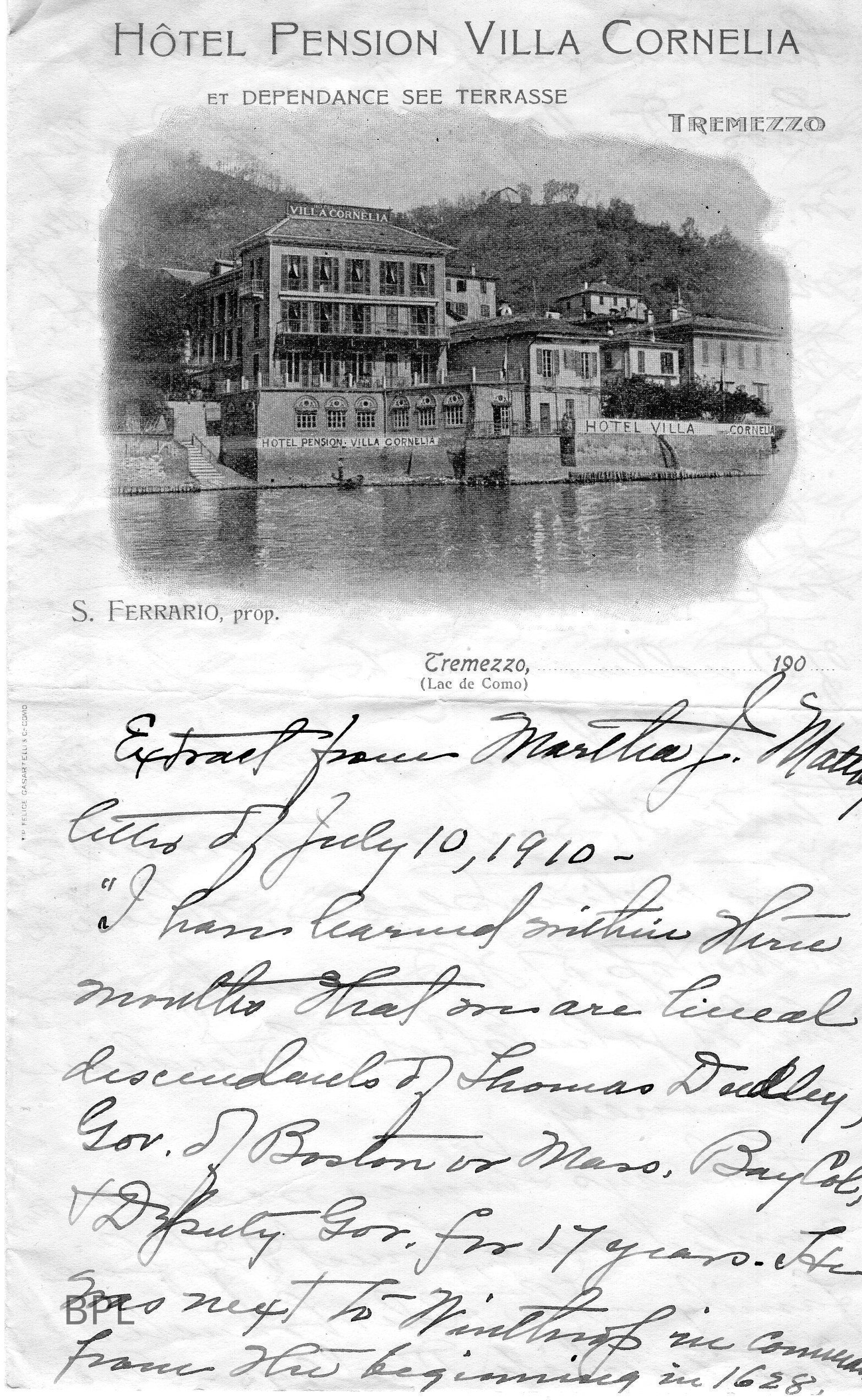 Extract of Letter of Martha J. Maltby Jul 10, 1910, of Ancestors, one of First is Thomas Dudley, Governor of Boston Mass. Bay Co.Cataloged By