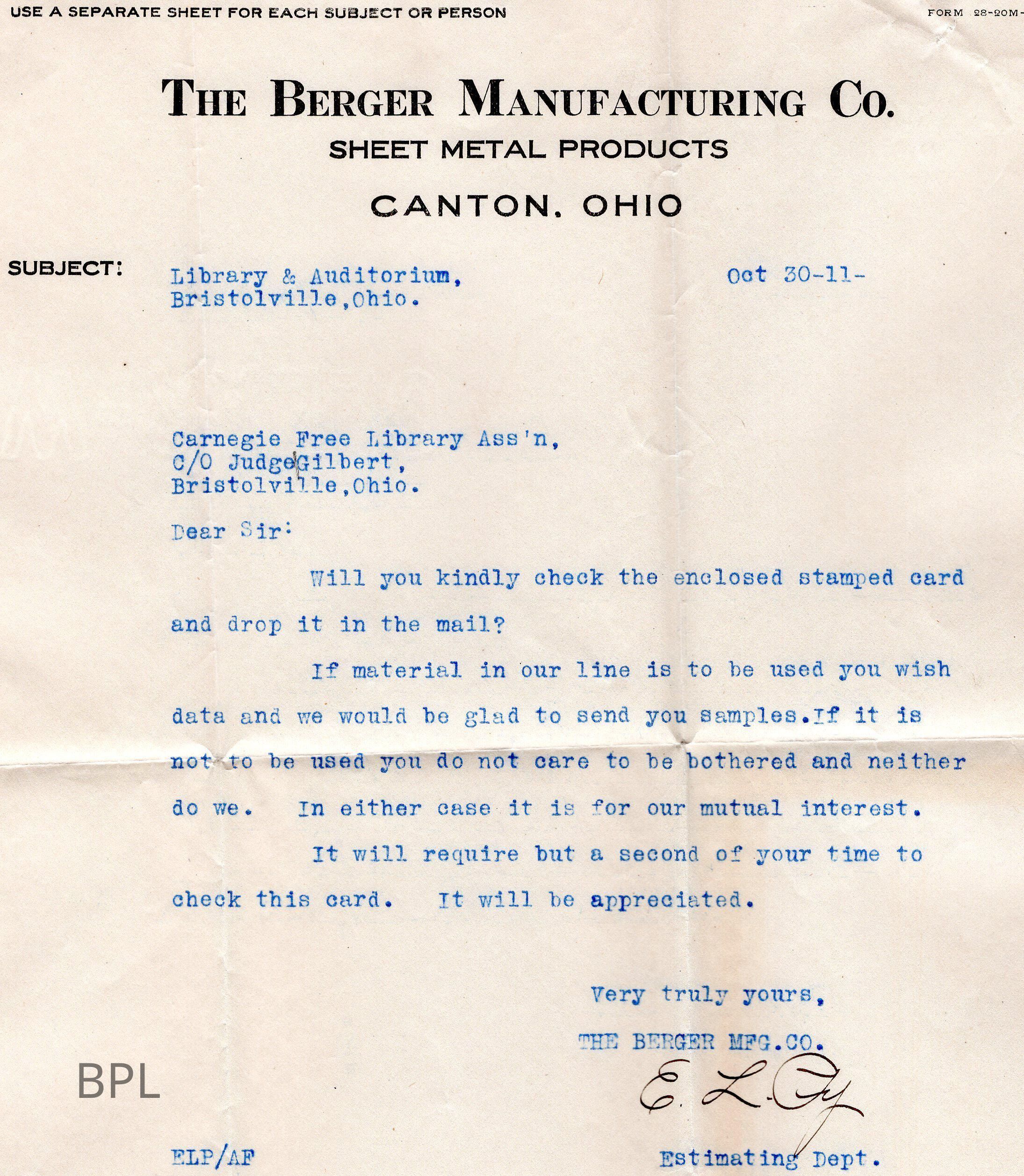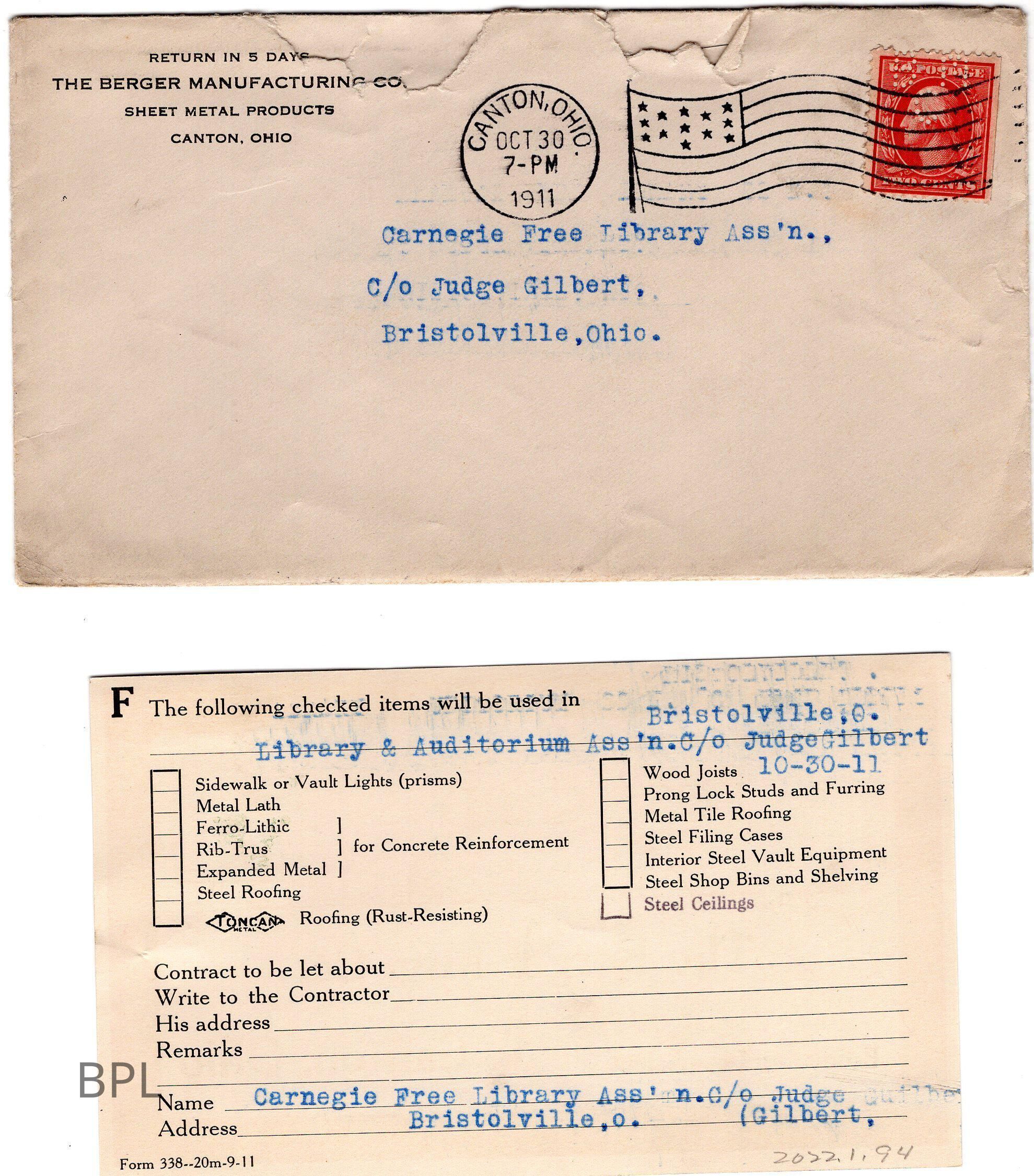 Envelope postcard, and letter from Berger Manufactuing Co. of Canton, Ohio for sale of sheet metal products, October 30, 1911.Cataloged By