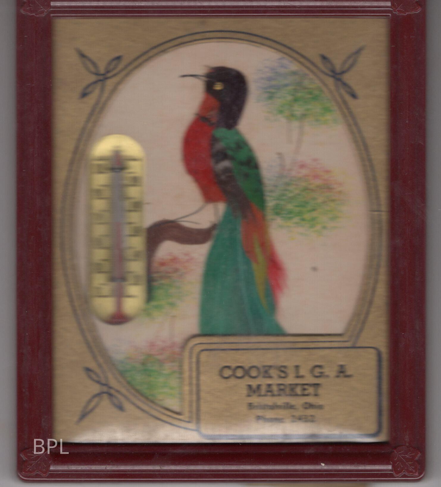 Framed picture ad with thermometer and colorful bird for Cook's I.G. A. marketCataloged By