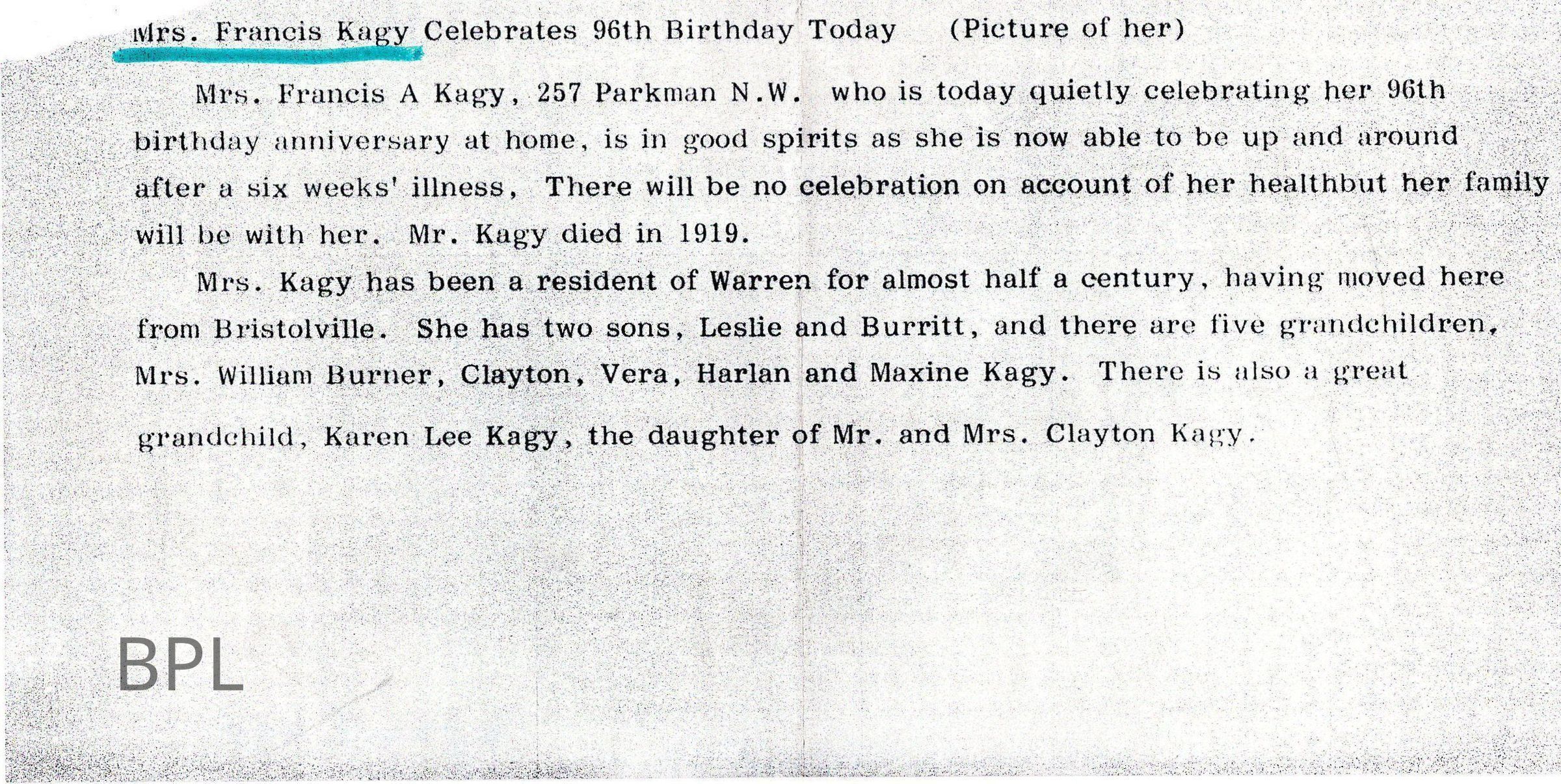 Note regarding 96th Birthday Celebration of Francis (Frances?) KagyCataloged By
