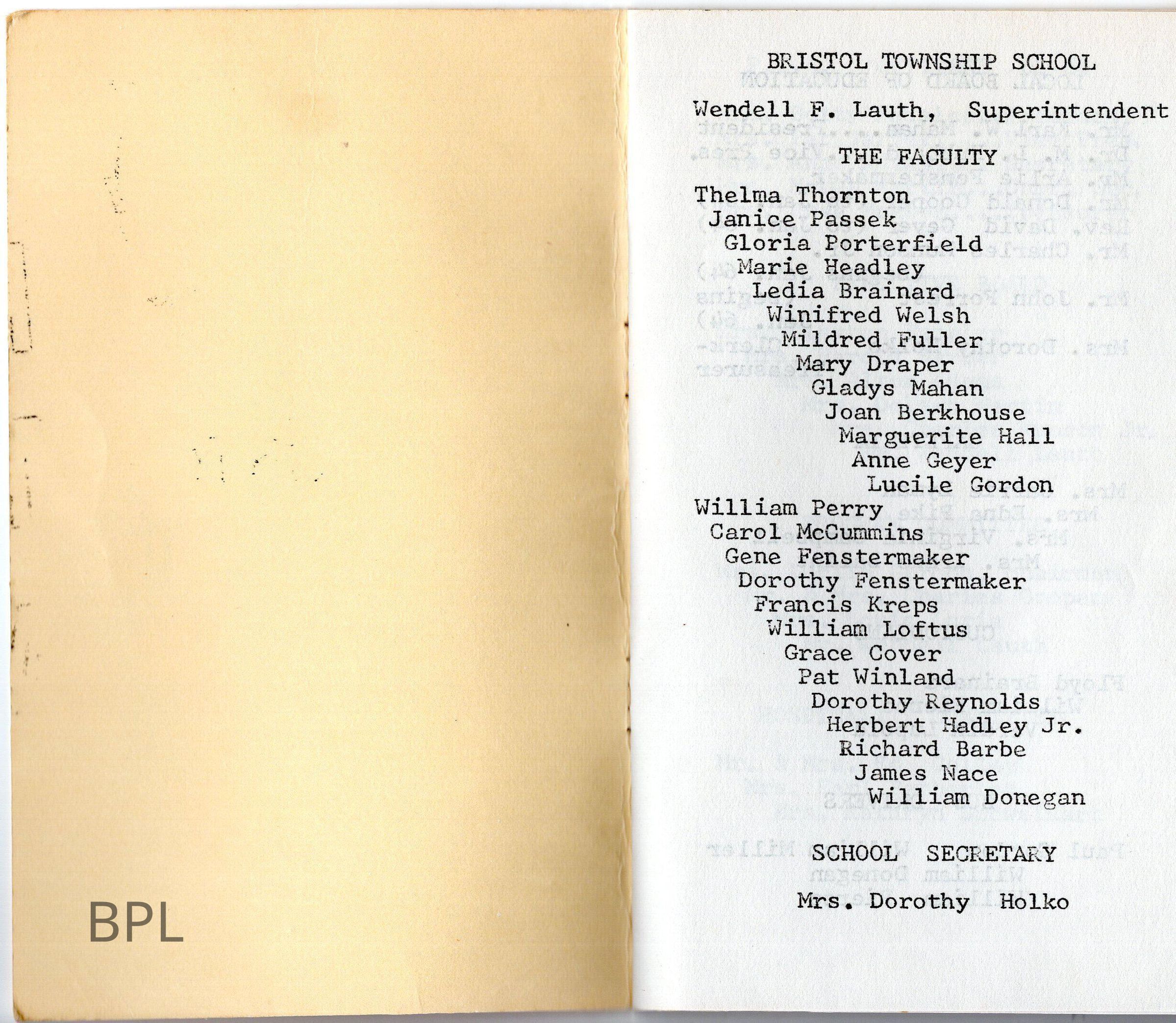 Bristol Parent Teachers Association, Bristol School, Lauth, Wendell, Holko, Dorothy L., Thornton, Thelma, Passek, Janice, Porterfield, Gloria, Headley, Marie, Brainard, Ledia, Welsh, Winifred, Fuller, Mildred, Draper, Mary, Mahan, Gladys, Berkhouse, Joan, Hall, Marguerite, Geyer, Anne, Gordon, Lucile, Perry, William, McCummins, Carol, Fenstermaker, Gene, Fenstermaker, Dorothy, Kreps, Francis, Loftus, William, Cover, Grace, Winland, Pat, Reynolds, Dorothy, Hadley, Herbert, Barbe, Richard, Nace, James E., Donegan, William