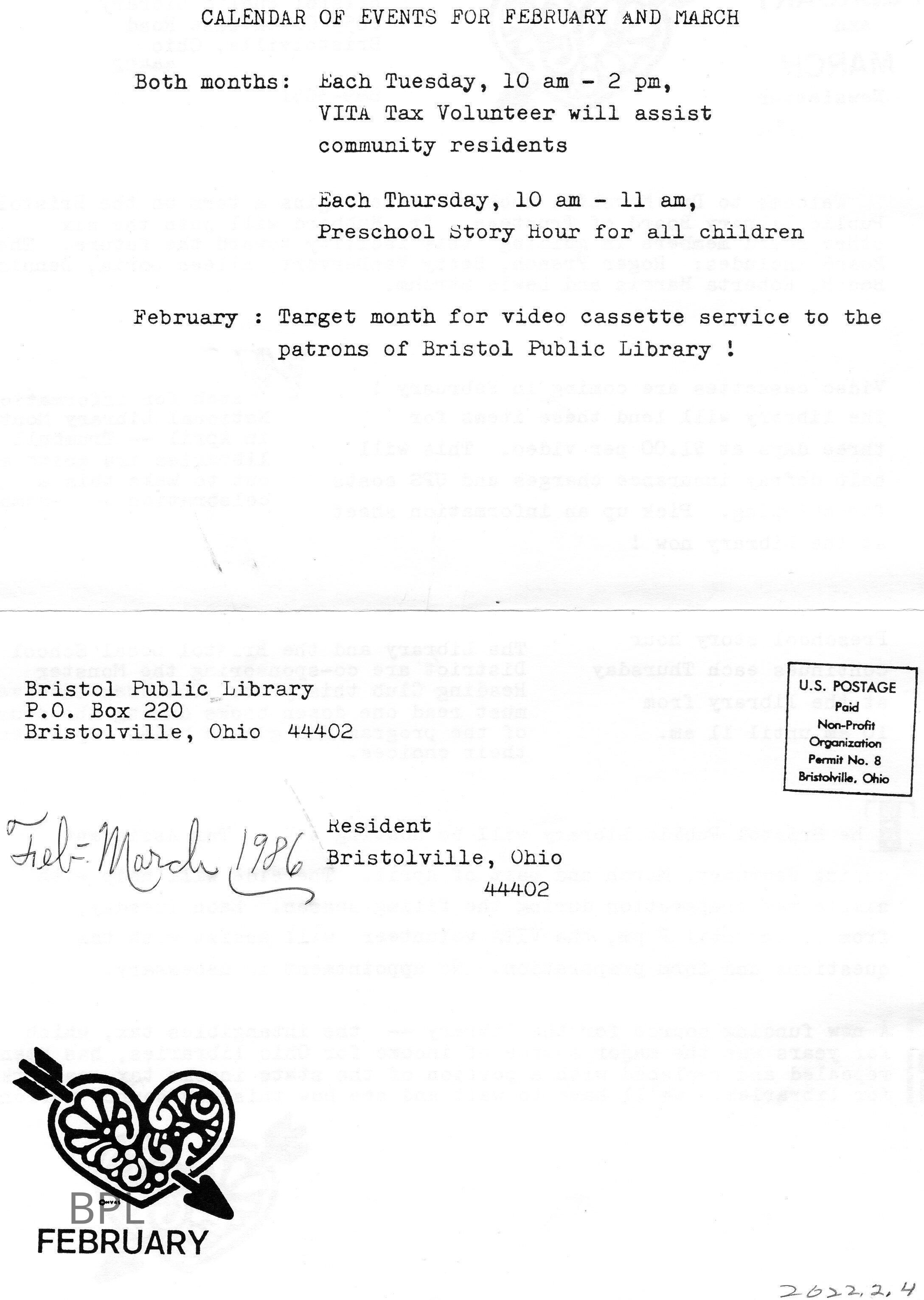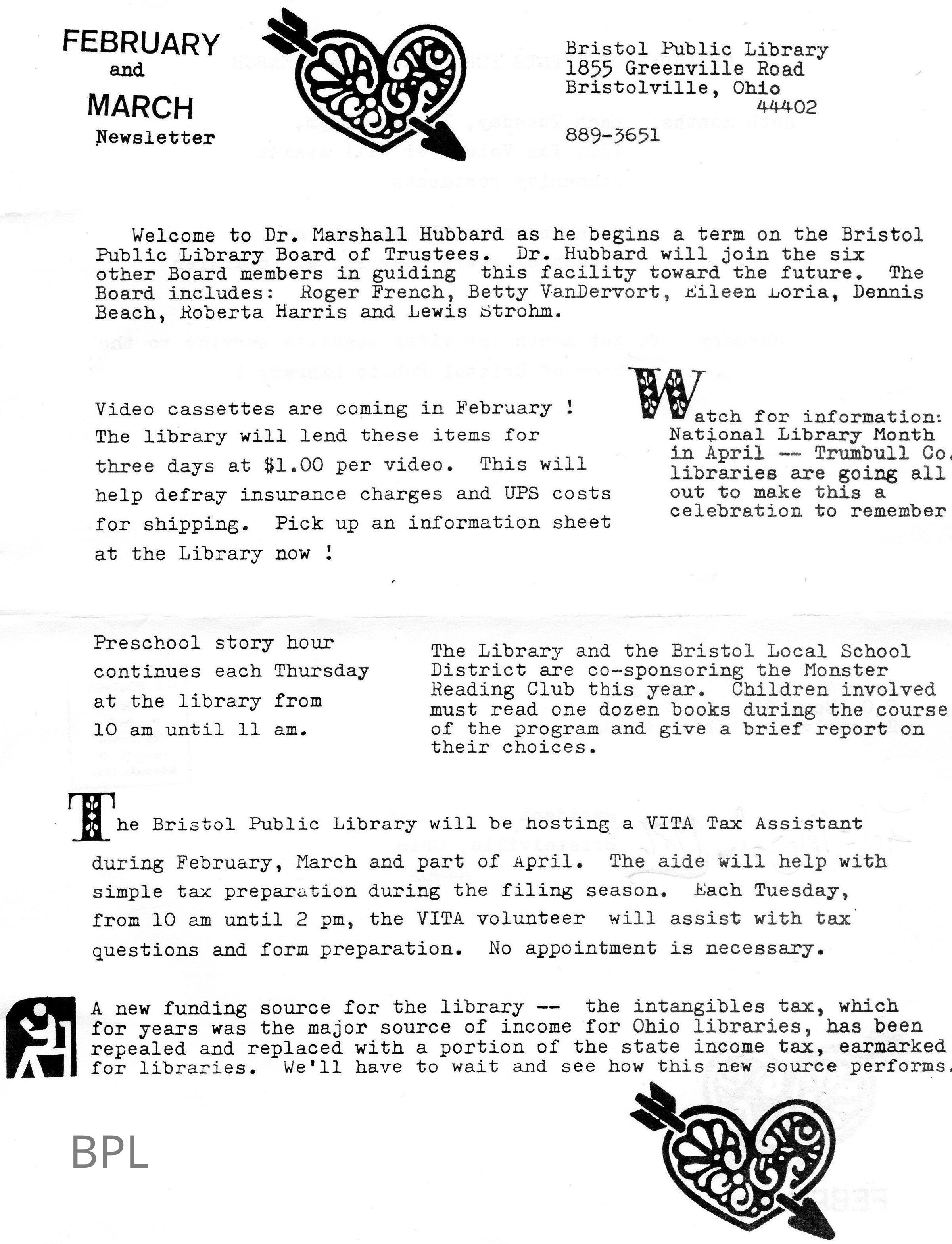 Bristol Public Library Newsletter February/March 1986, announcing Dr Marshall Hubbard as new Board Trustee. Other members include Roger French, Betty VanDervort, Eileen Loria, Dennis Beach, Roberta Harris and Lewis Strohm