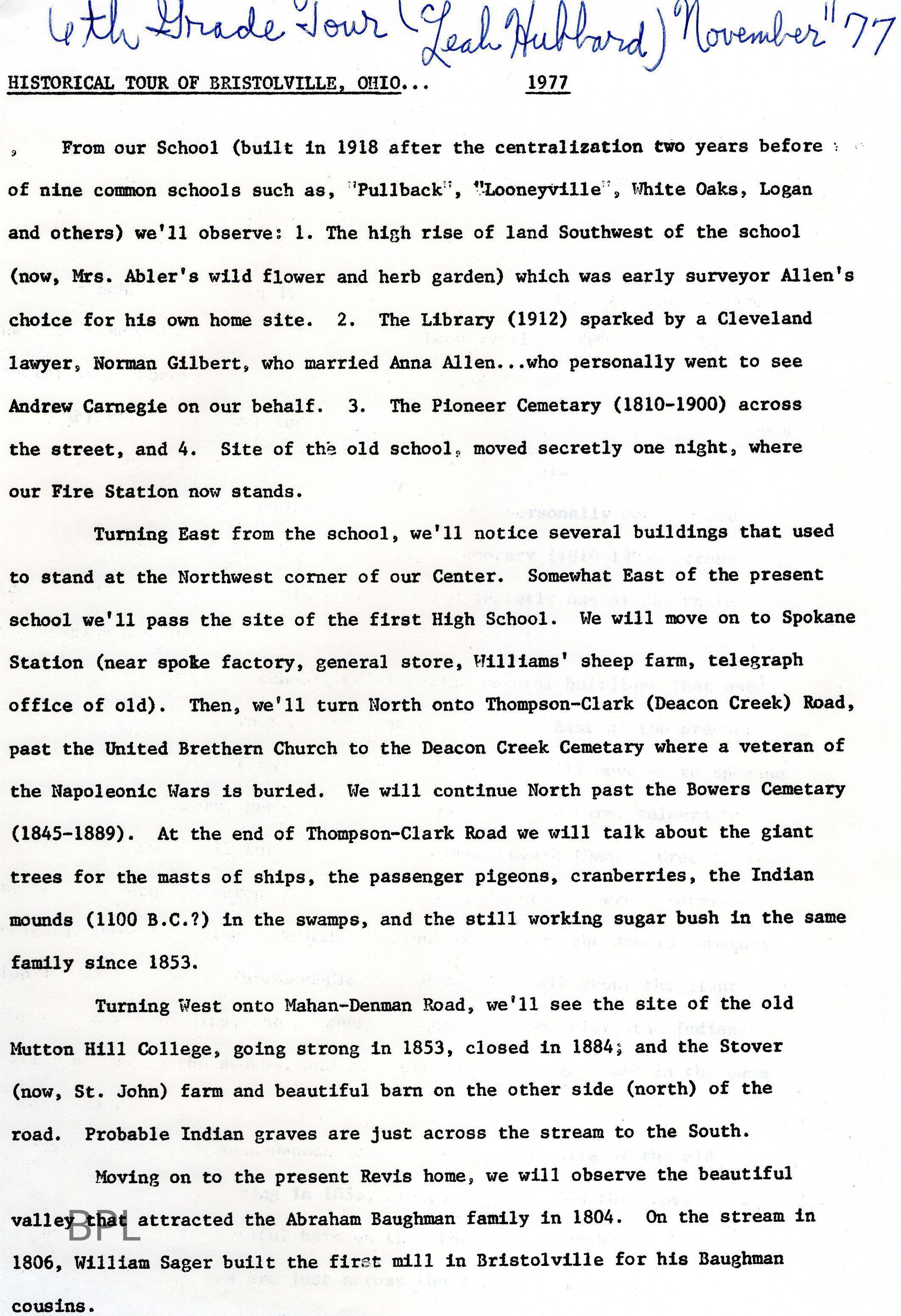 Historical Tour of Bristolville, Ohio, November 1977 by Leah HubbardCataloged By
