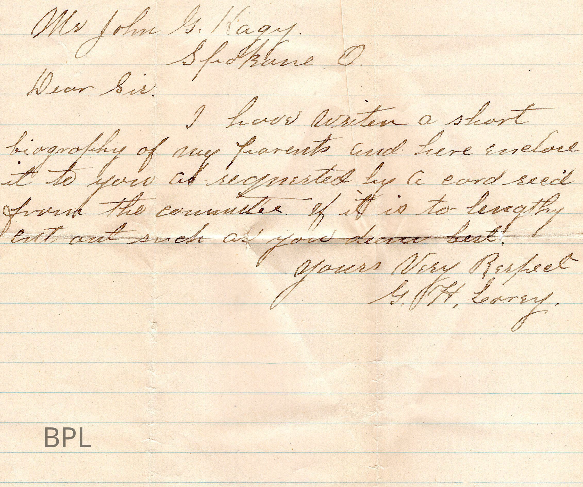 Letter to John G. Kagy regarding History of Unknown Family? from G. H. ?L?Corey. No additional information found.Cataloged By