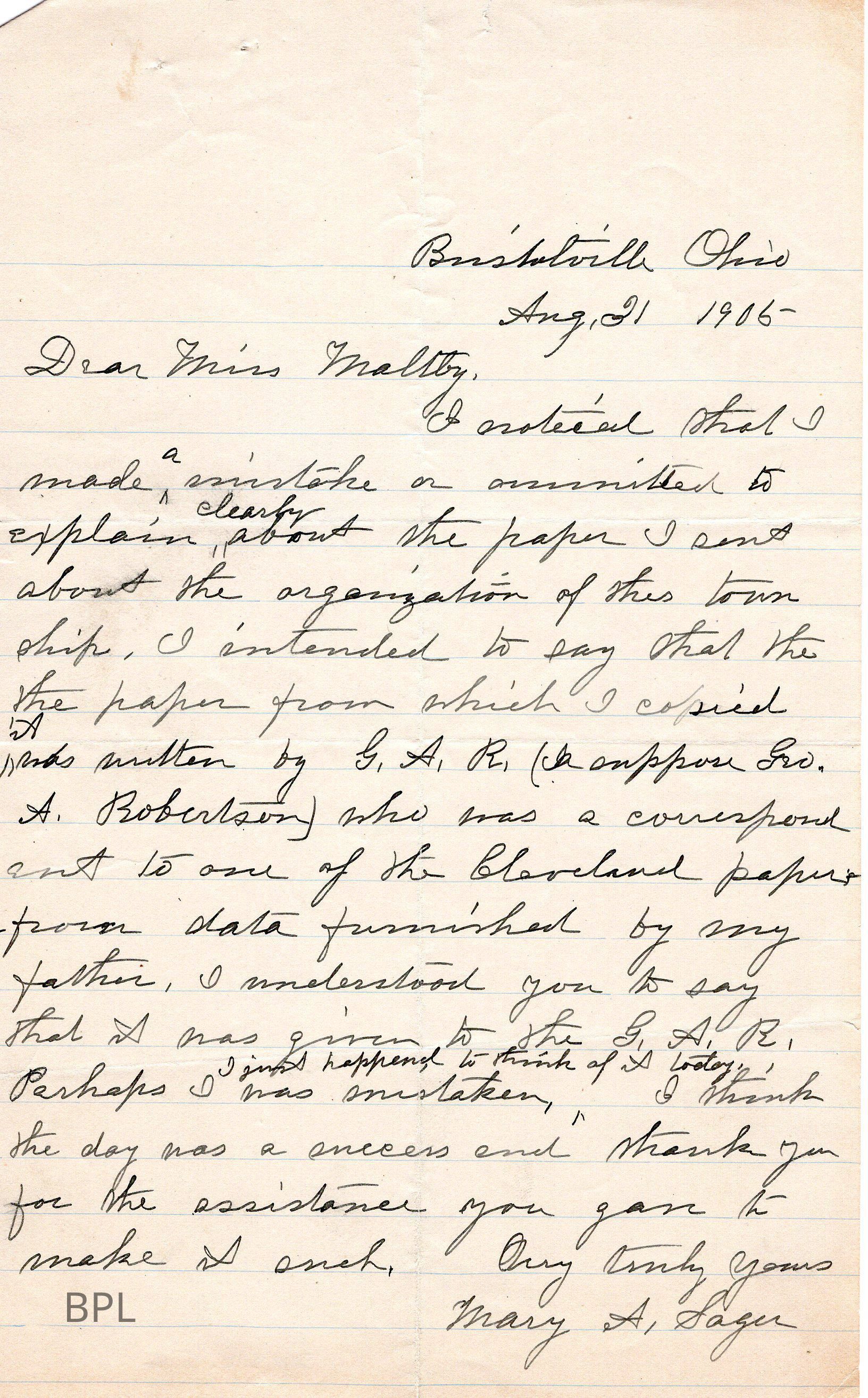 Letter, August 21, 1905, to Martha Maltby from Mary A. SagerCataloged By