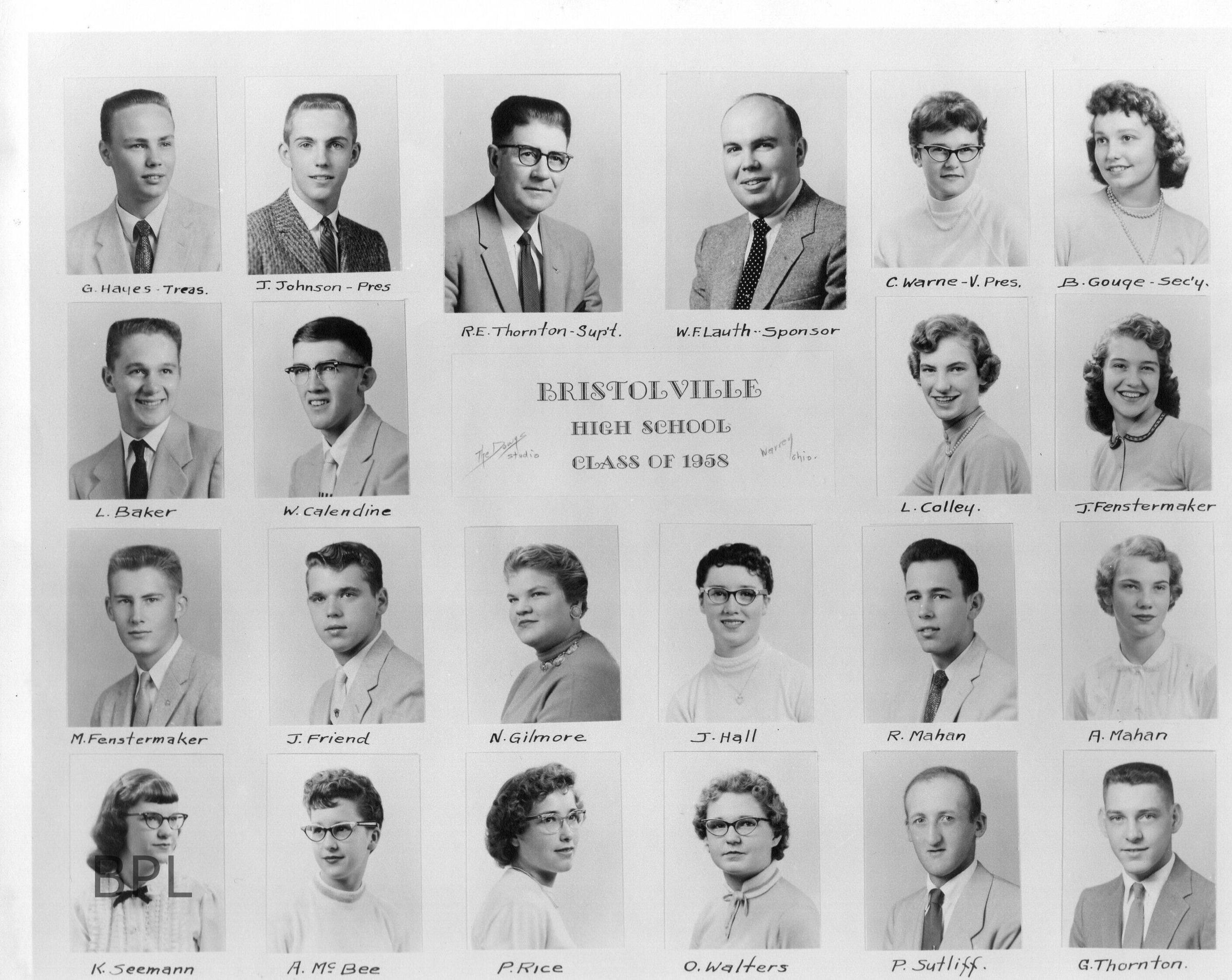 Bristol School, Hayes, Gene, Johnson, James, Warne, Carol, Gouge, Beverly, Baker, Larry, Callendine, Bill, Colley, Levonia, Fenstermaker, Janice, Fenstermaker, Milton, Friend, John, Gilmore, Nancy, Hall, Joan, Mahan, Ray K., Mahan, Alice Mellie, Seemann, Kathleen M., McBee, Anenete Victoria, Rice, Patsy Ann, Walters, Olive, Sutliff, Patrick M., Thornton, George Charles, Thornton, R. E., Lauth, Wendell