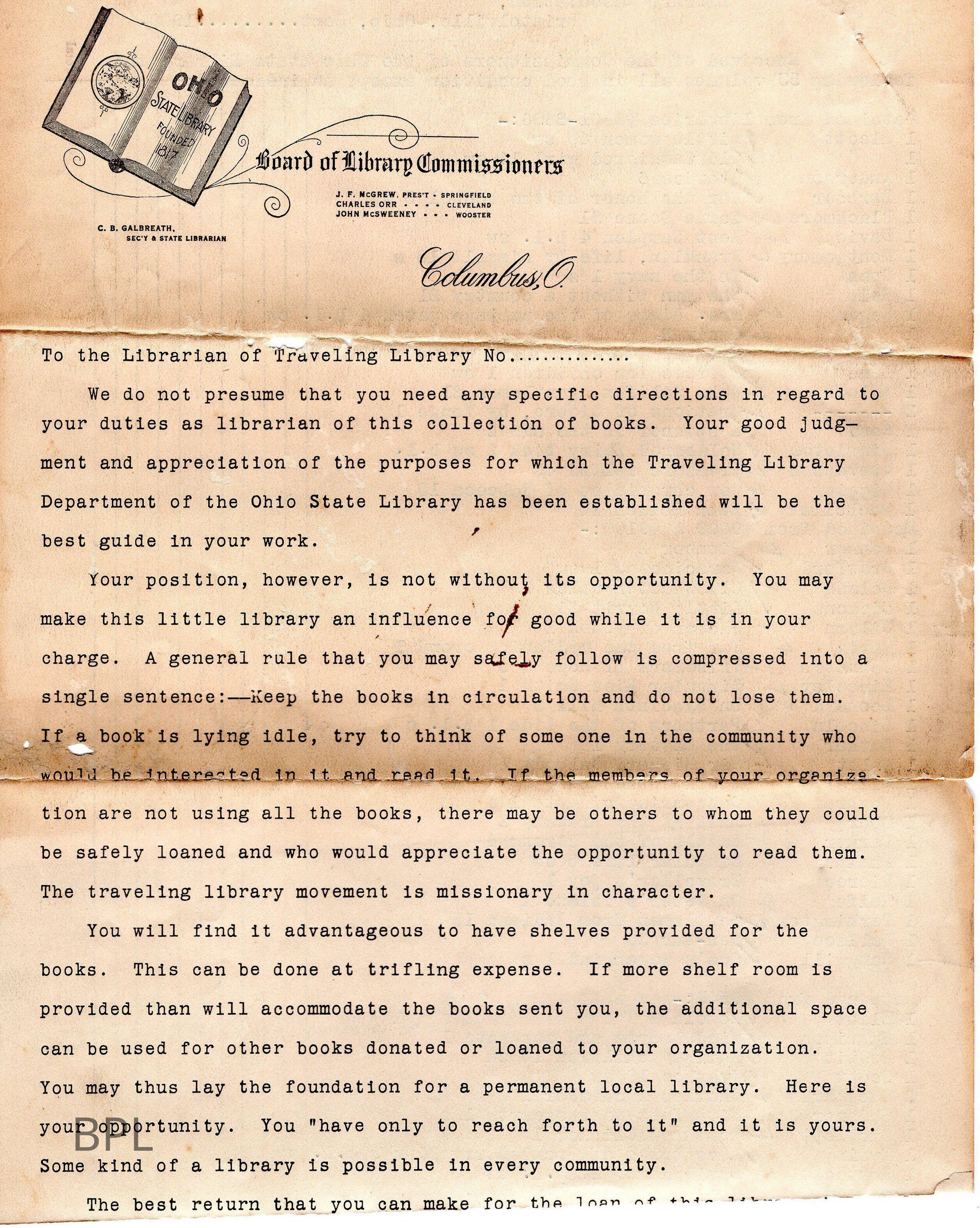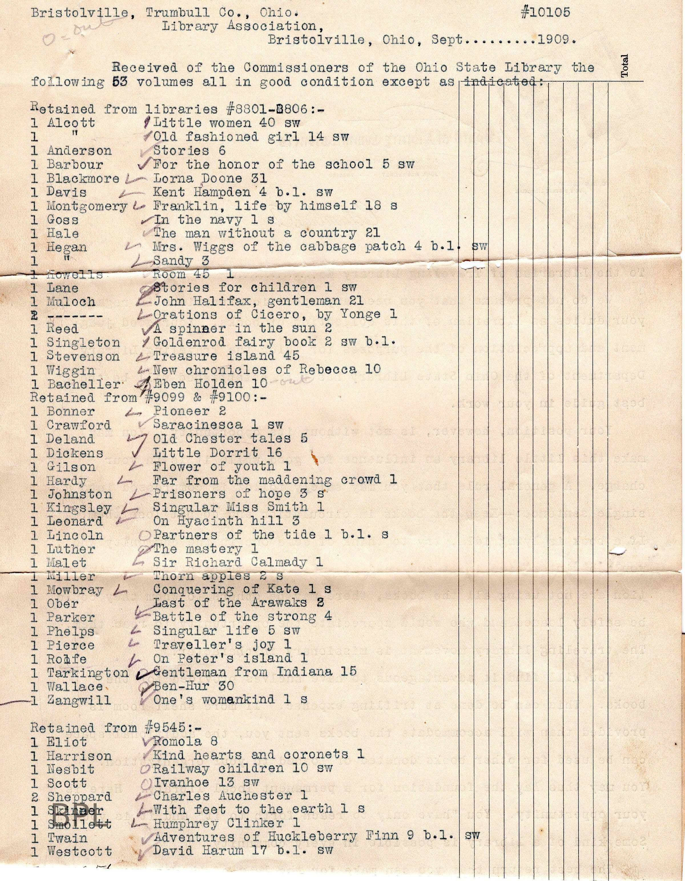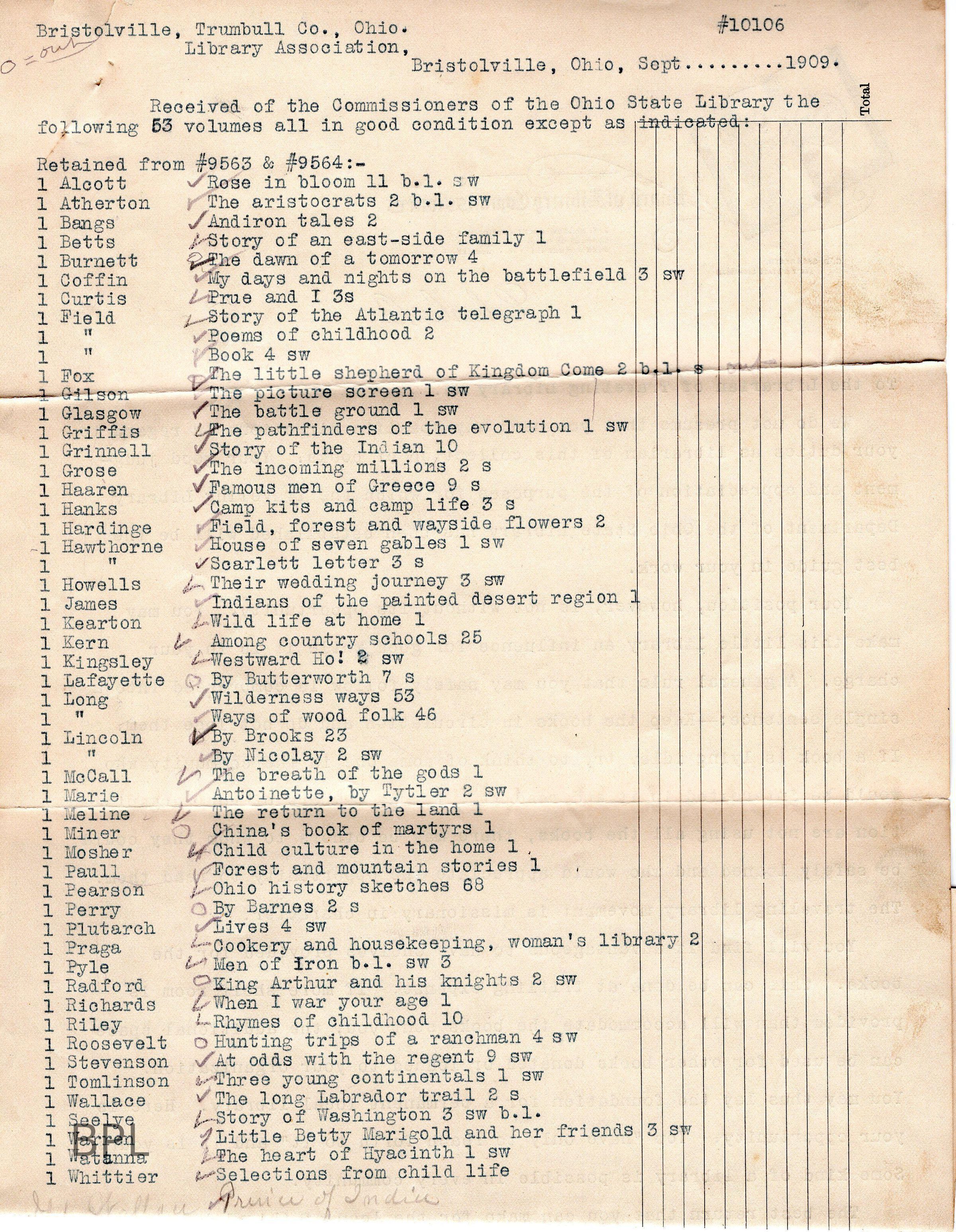 Letter from Ohio State Library Board of Library Commissioners with list of books being sent from lending library, September , 1909Cataloged By