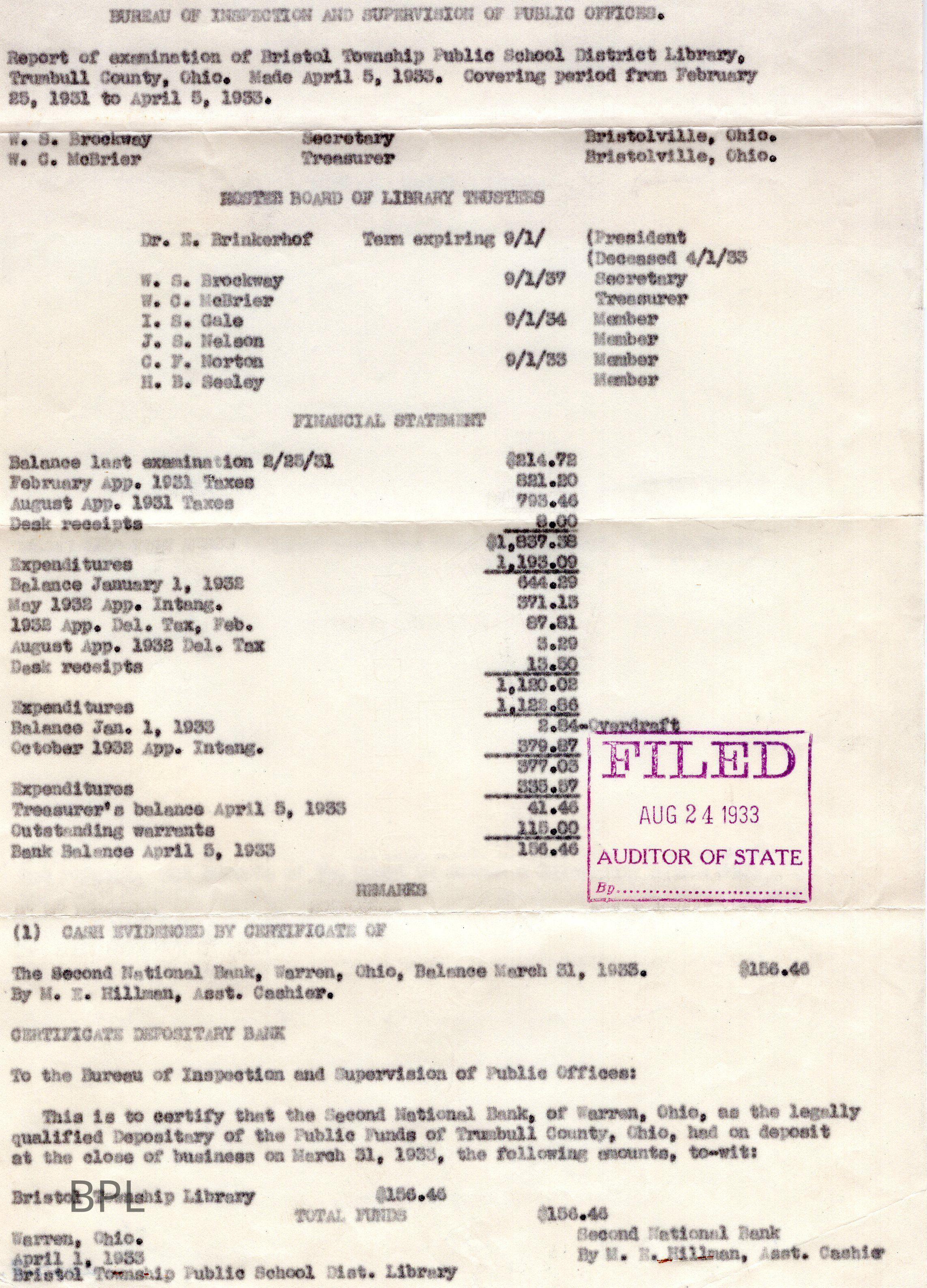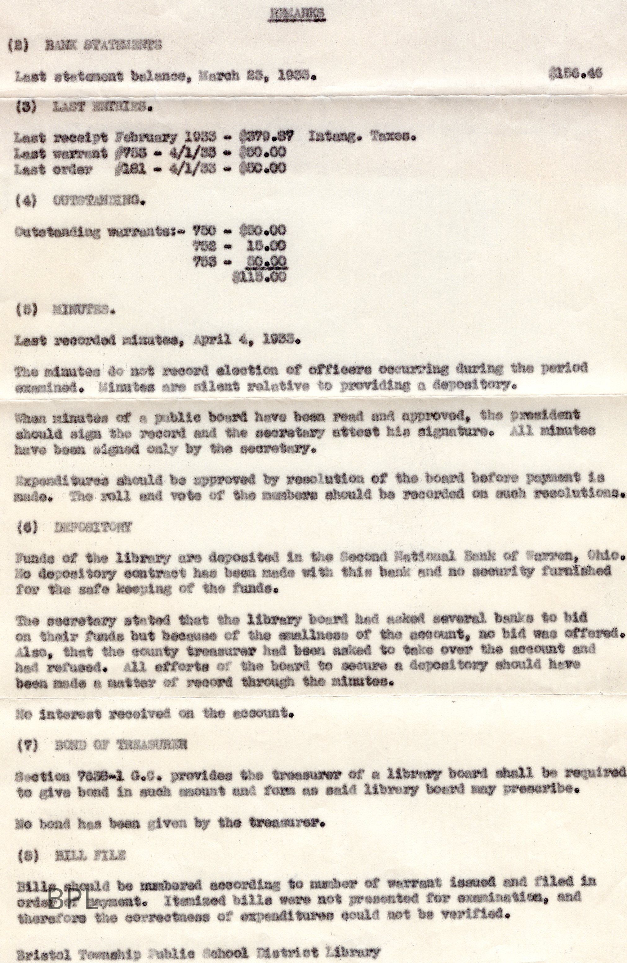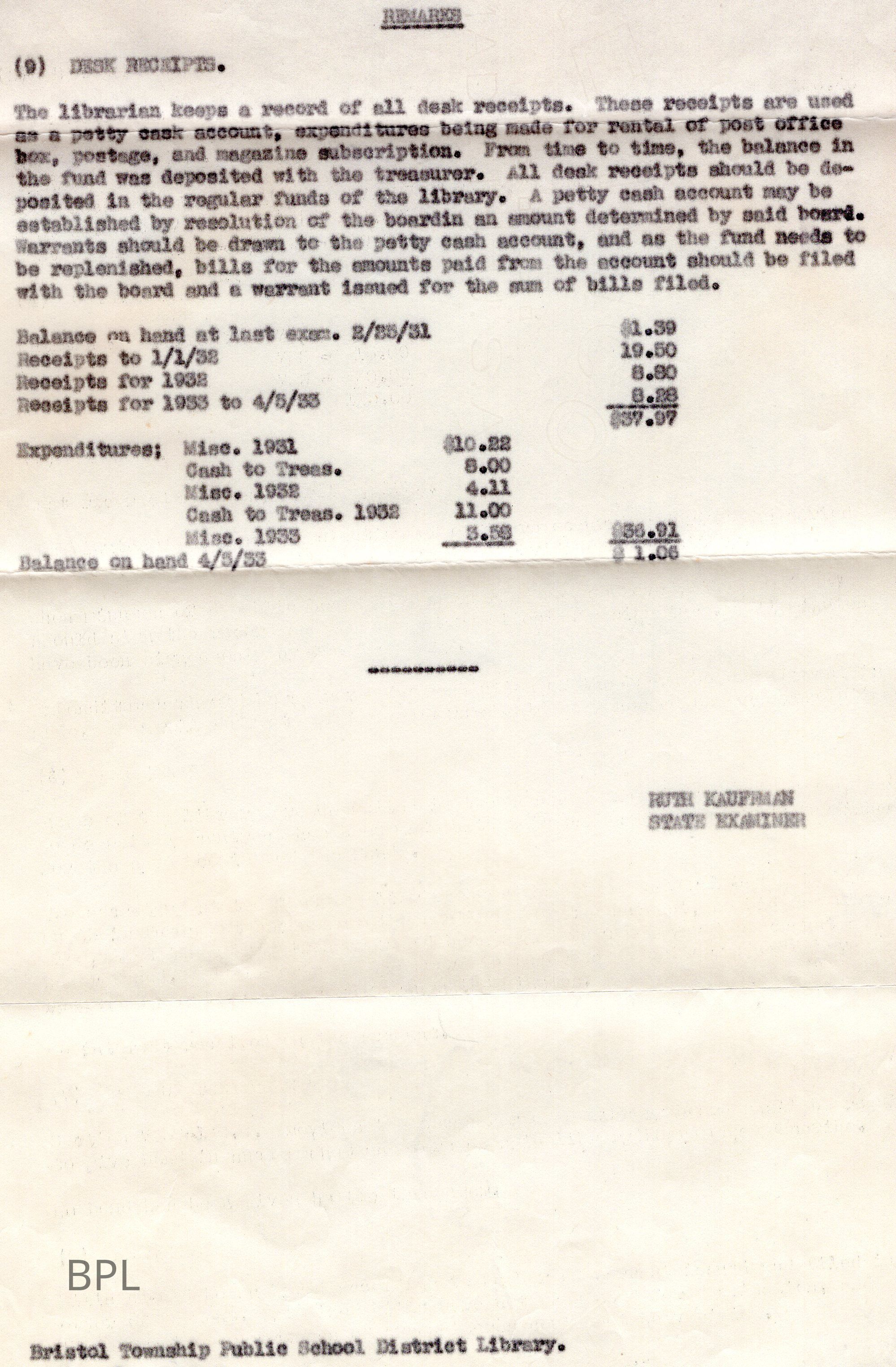 Bristol Township Public Library School District Inspection Report, April 5, 1933