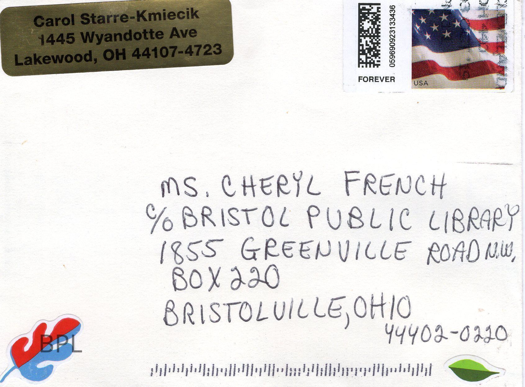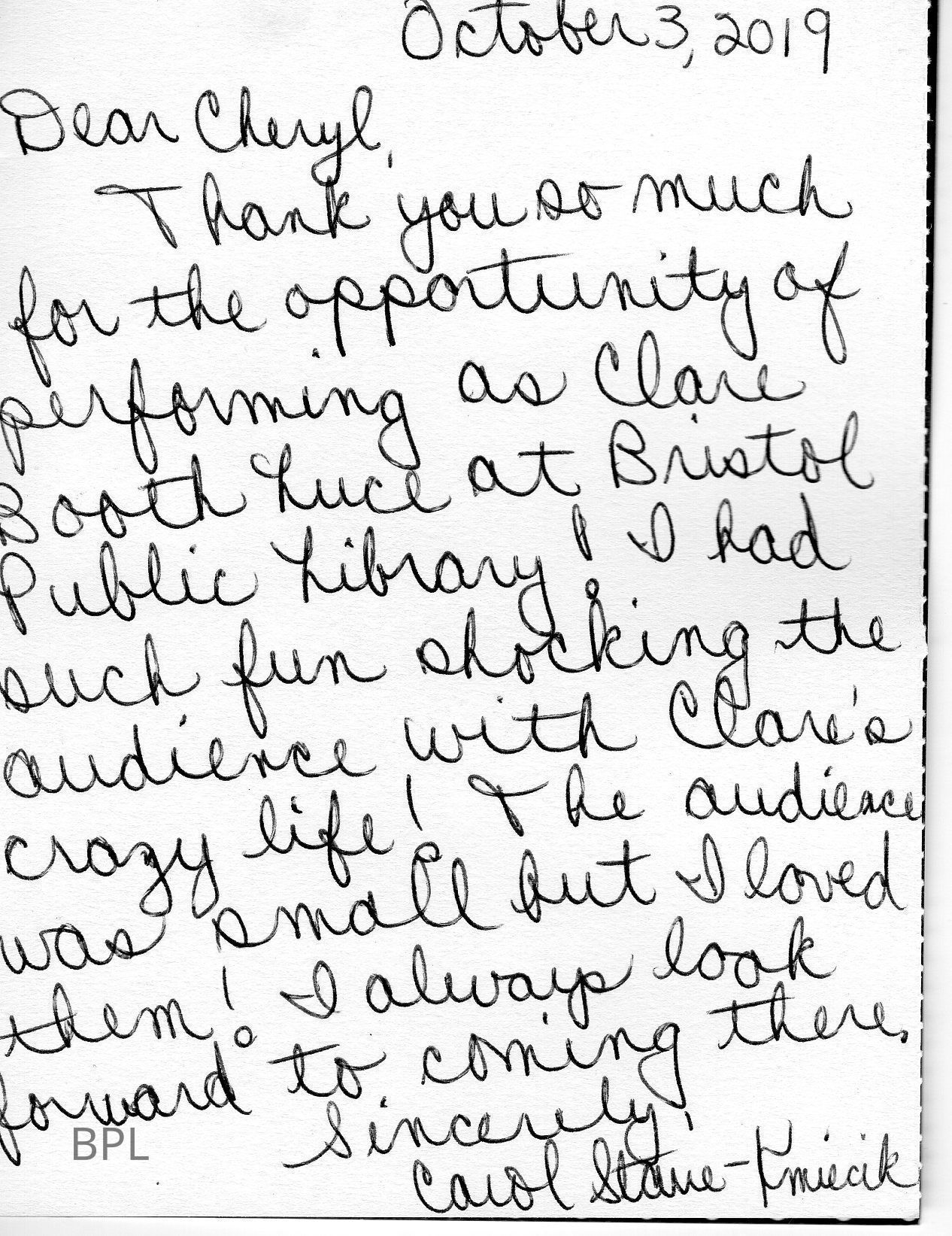 Thank You Card from Carol Starre Kmiecik to Friends of Bristol Public Library for Opportunity to Present Clare Booth Luce at the Library, October, 2019Cataloged By