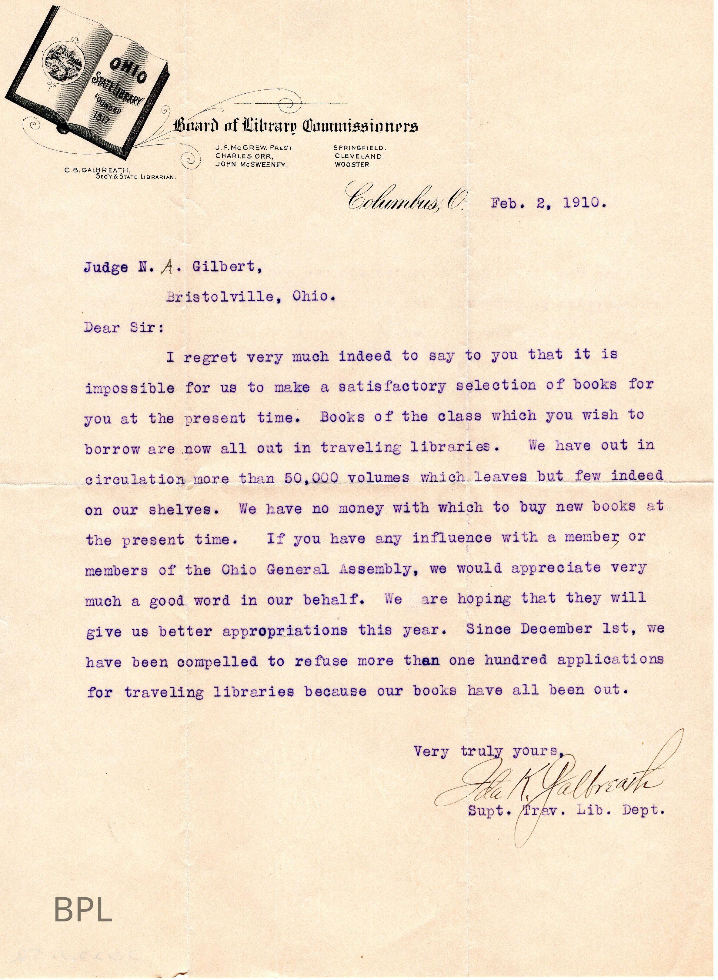 Letter to Judge N.A. Gilbert from Ida K Galbreth of Ohio Board of Library Commissioners stating unable to supply books requested at this time from traveling library due to all books are out at present. Also requesting that if he has any influence with the Ohio General Assembly, please do so for more appropriations are needed. February 2, 1910Cataloged By