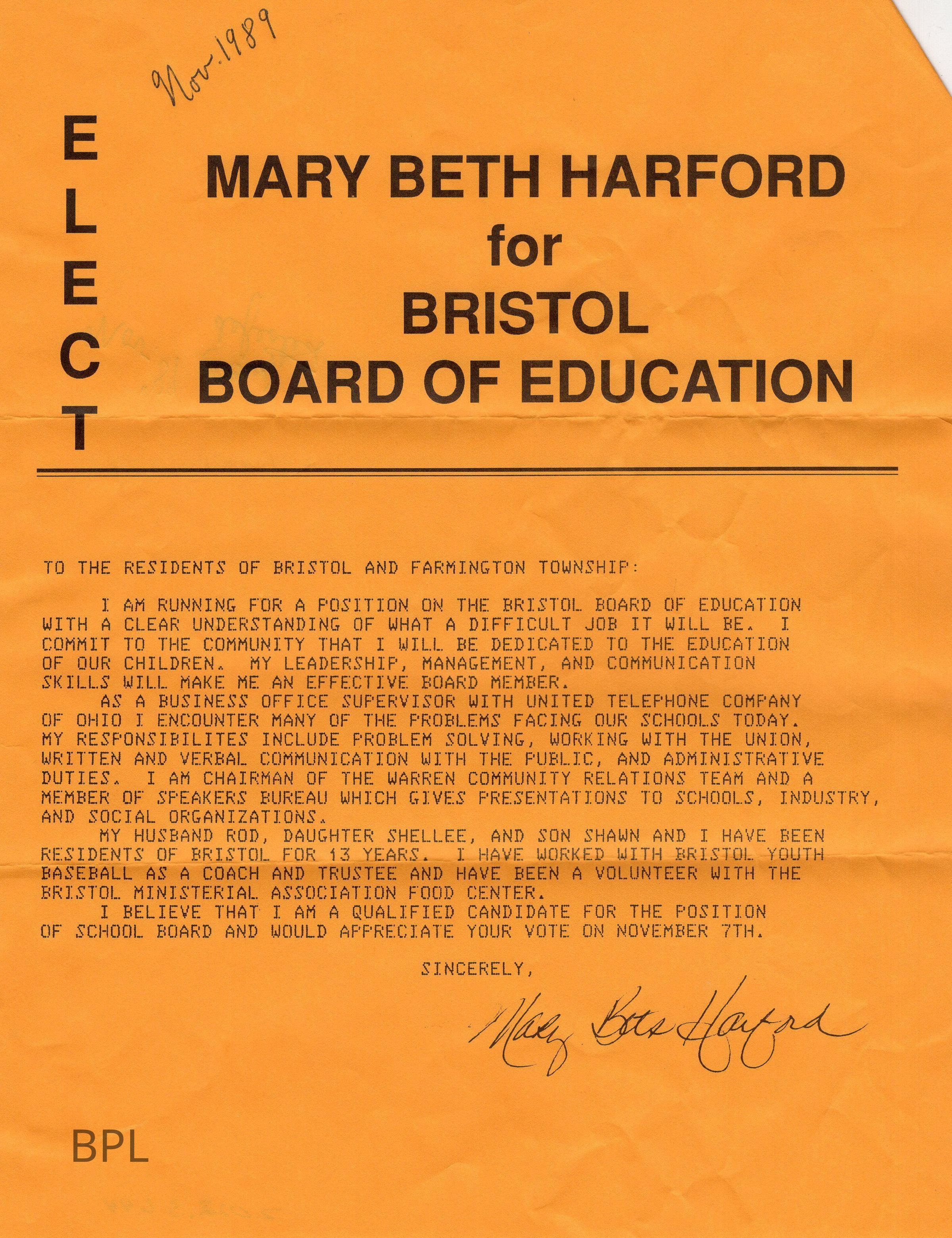 Flyer for Mary Beth Harford for Election to Bristol School Board , November 1989Cataloged By