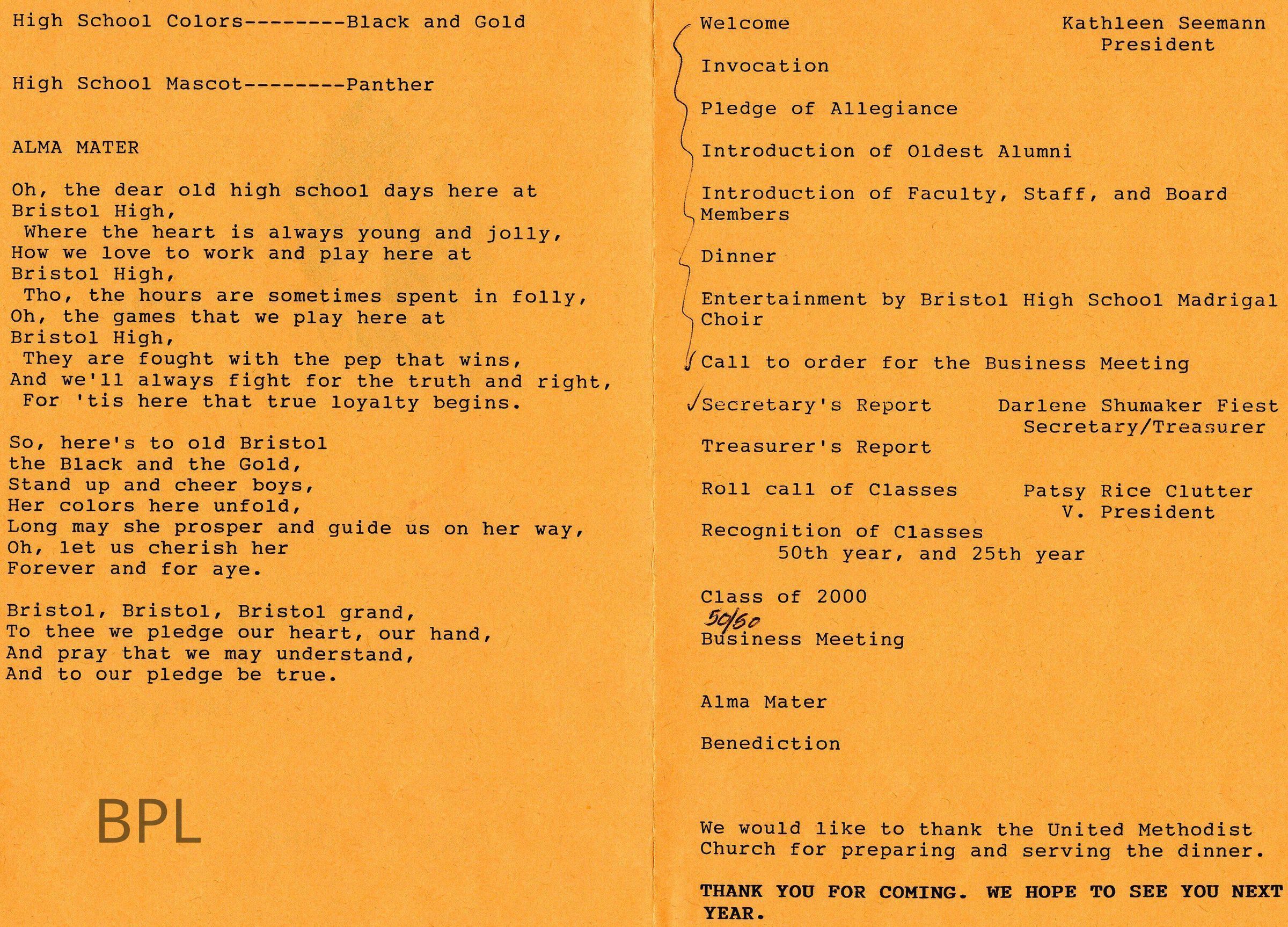 Bristol High School Alumni Banquet Program.2000Entry/Object ID
