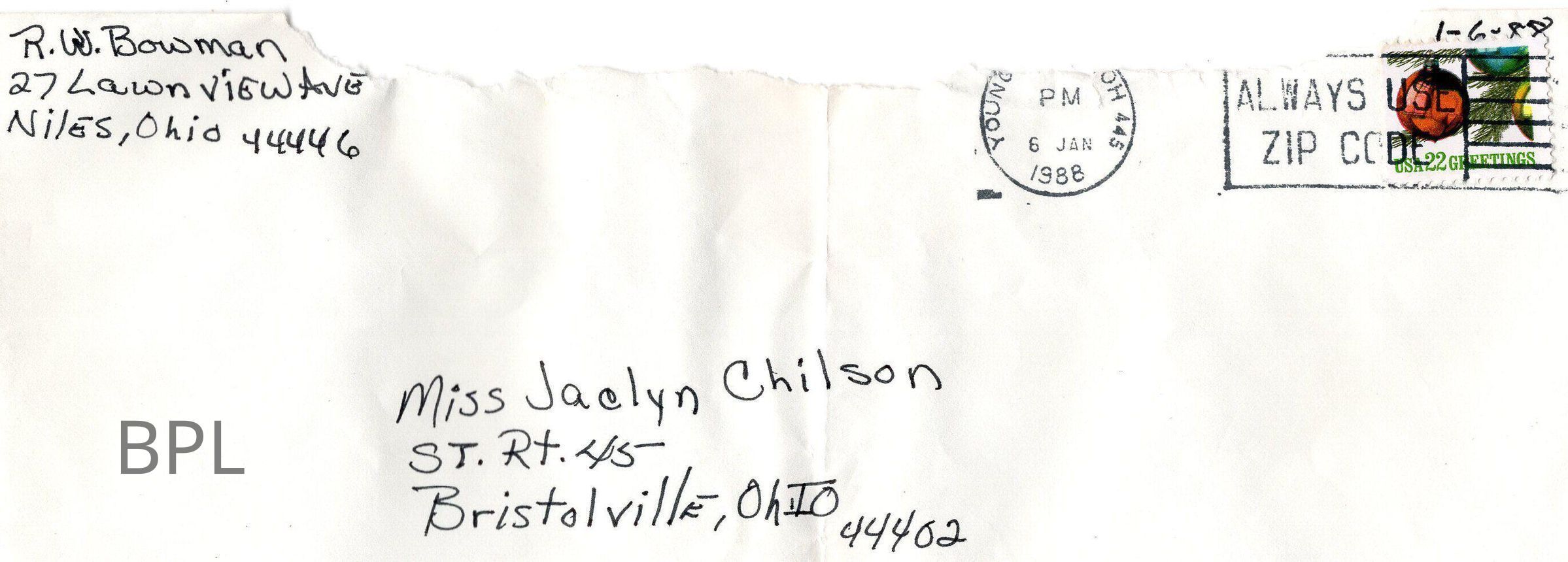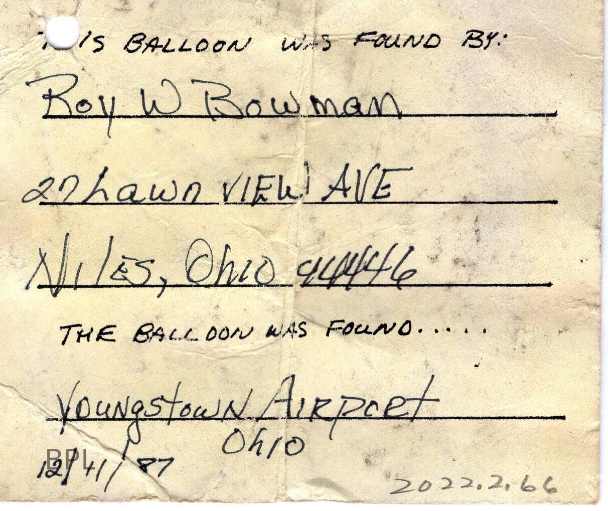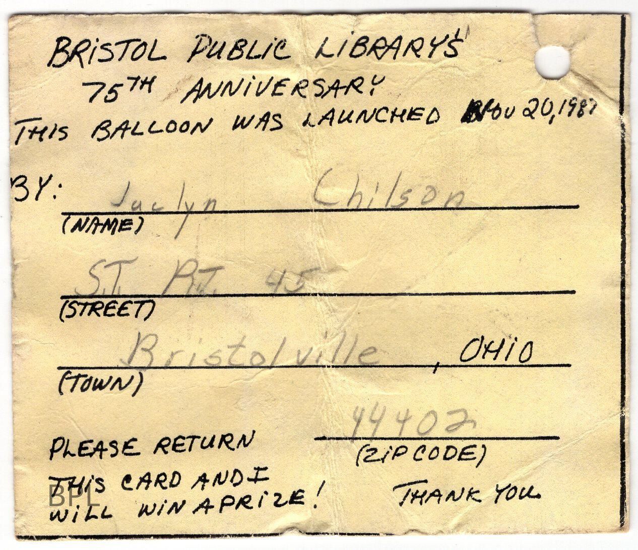 Envelope and card from balloon launch for 75th anniversary of Bristol Public Library, balloon found December 11, 1987, by Roy W. Bowman at the Youngstown Airport, launched by Jaclyn Chilson on November 20, 1987.Cataloged By