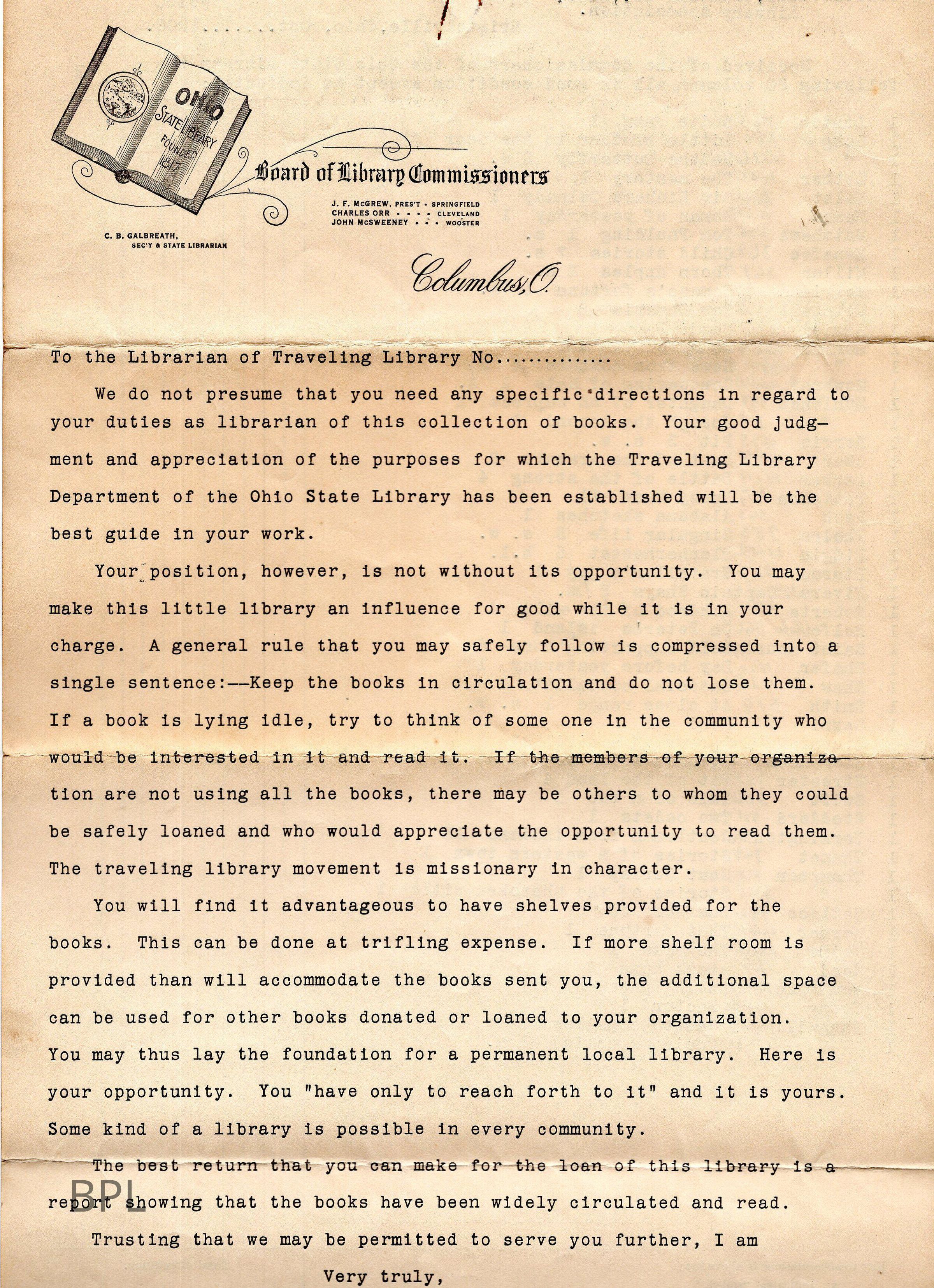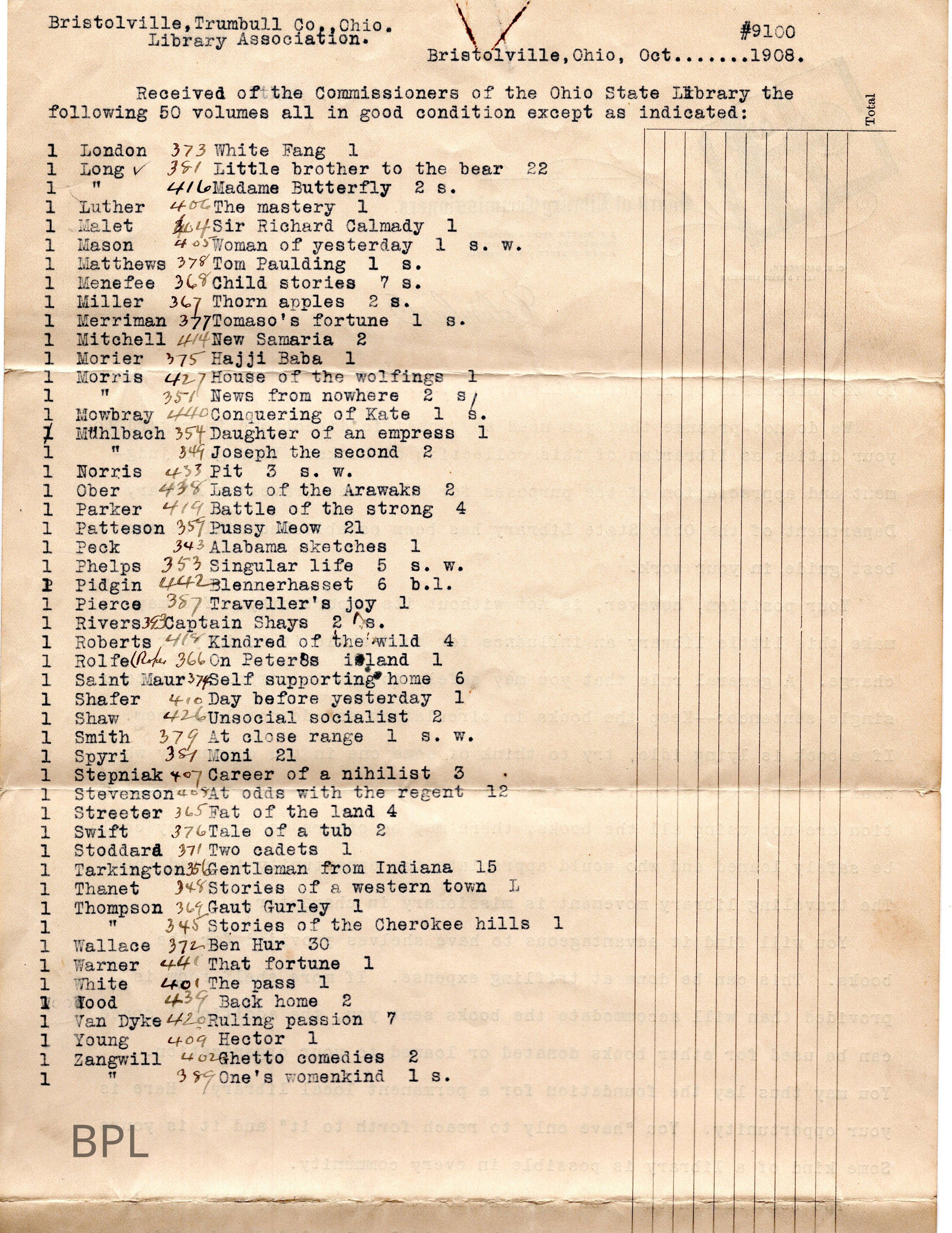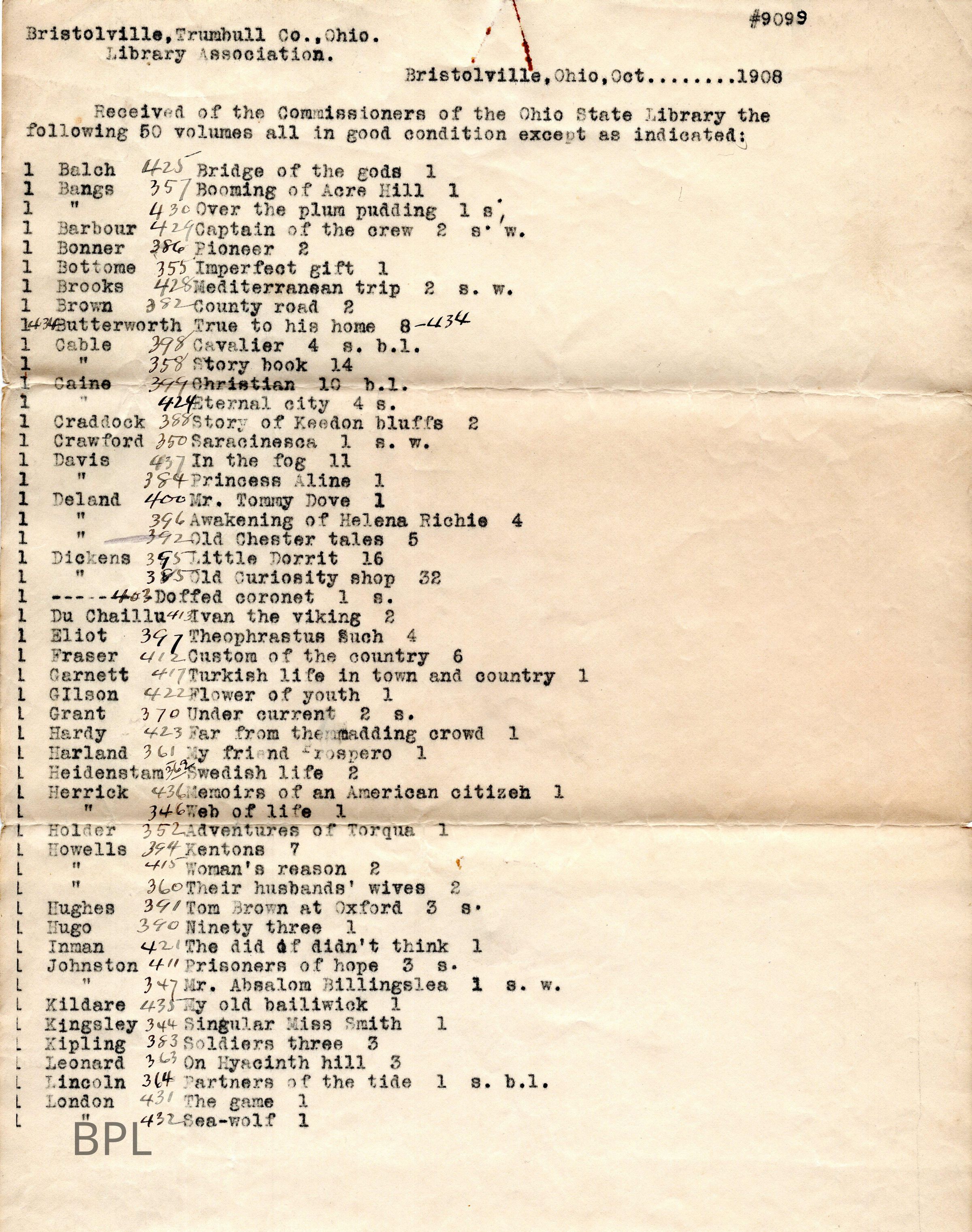 Letter from Board of Library Commissioners state of Ohio to Bristol Traveling Library, containing records of 100 books sent to Bristol October 1908.Cataloged By