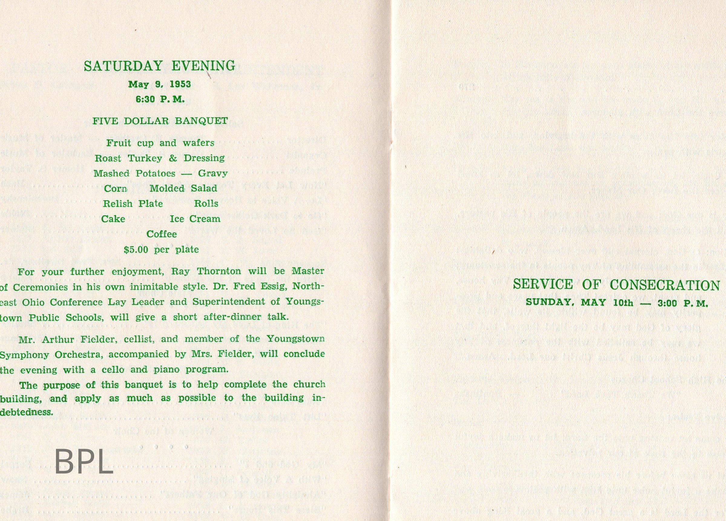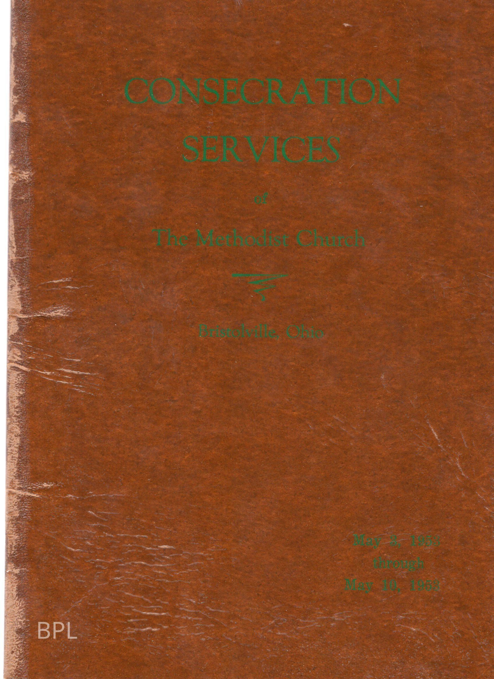 Consecration Services Bristolville, Ohio Methodist Church, May 1953. For the new church built in 1953 after 1951 fire destroyed first churchCataloged By