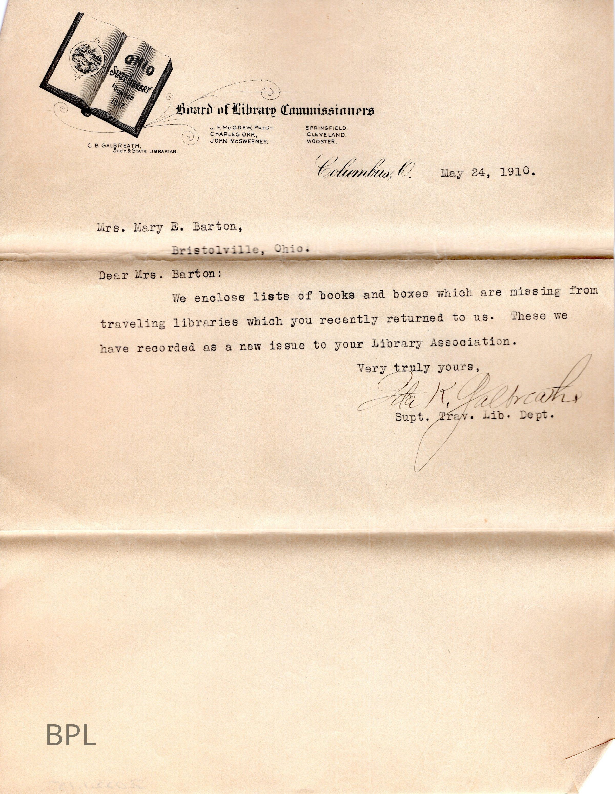 Letter from Ida K Galbreath of the Board of Library Commissioners to Mrs. Mary E. Barton, regarding a list of books missing in May 24, 1910.Cataloged By