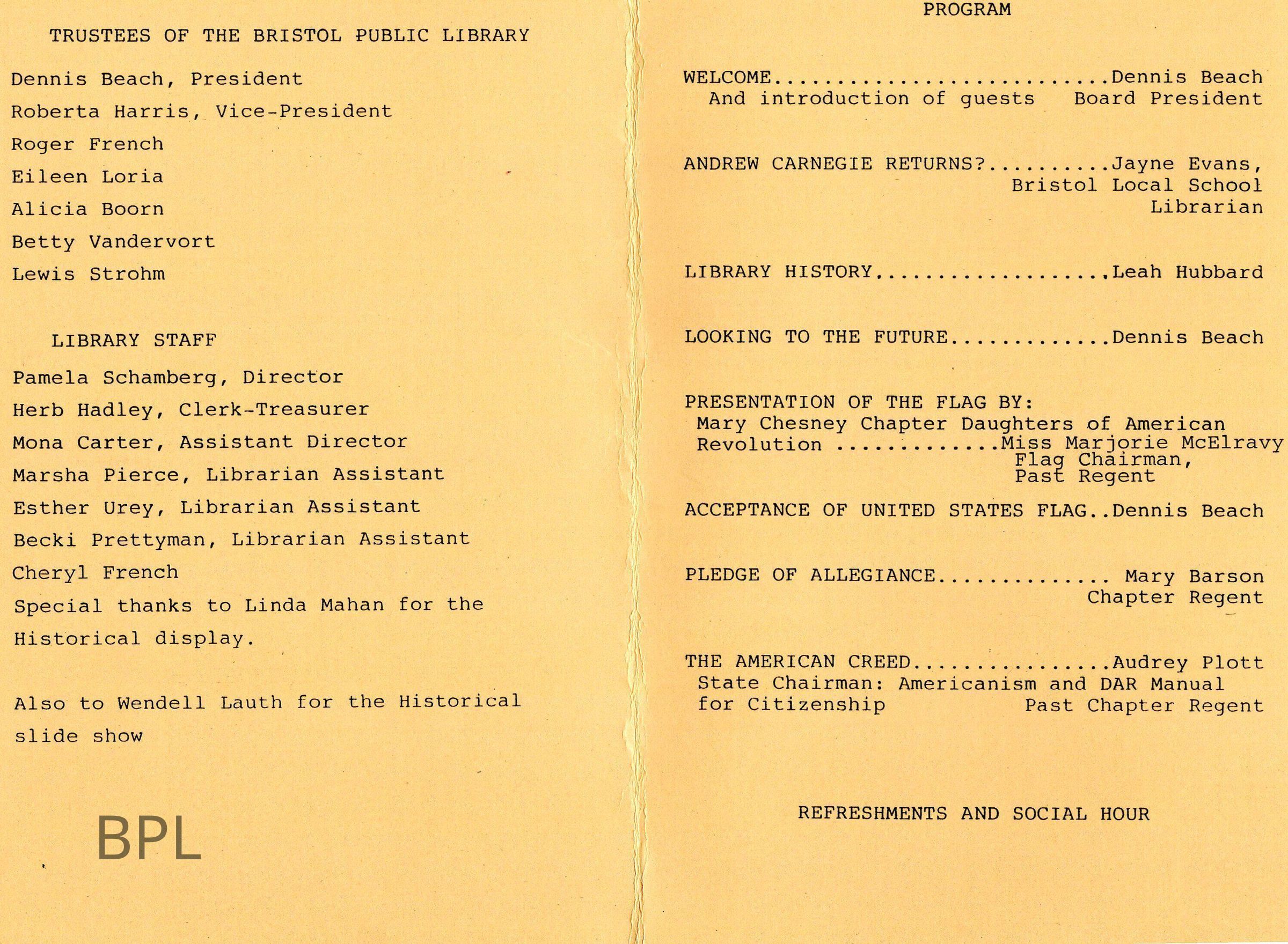 Program of Bristol Public Library for 75th anniversary, November 15, 1987