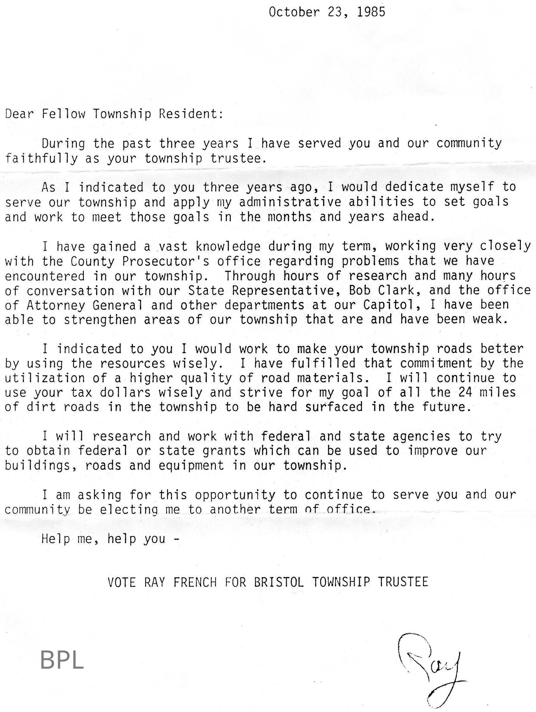 Letter for Ray French, Bristol Township Trustee asking voters for their vote in upcoming election, October 23, 1985Cataloged By