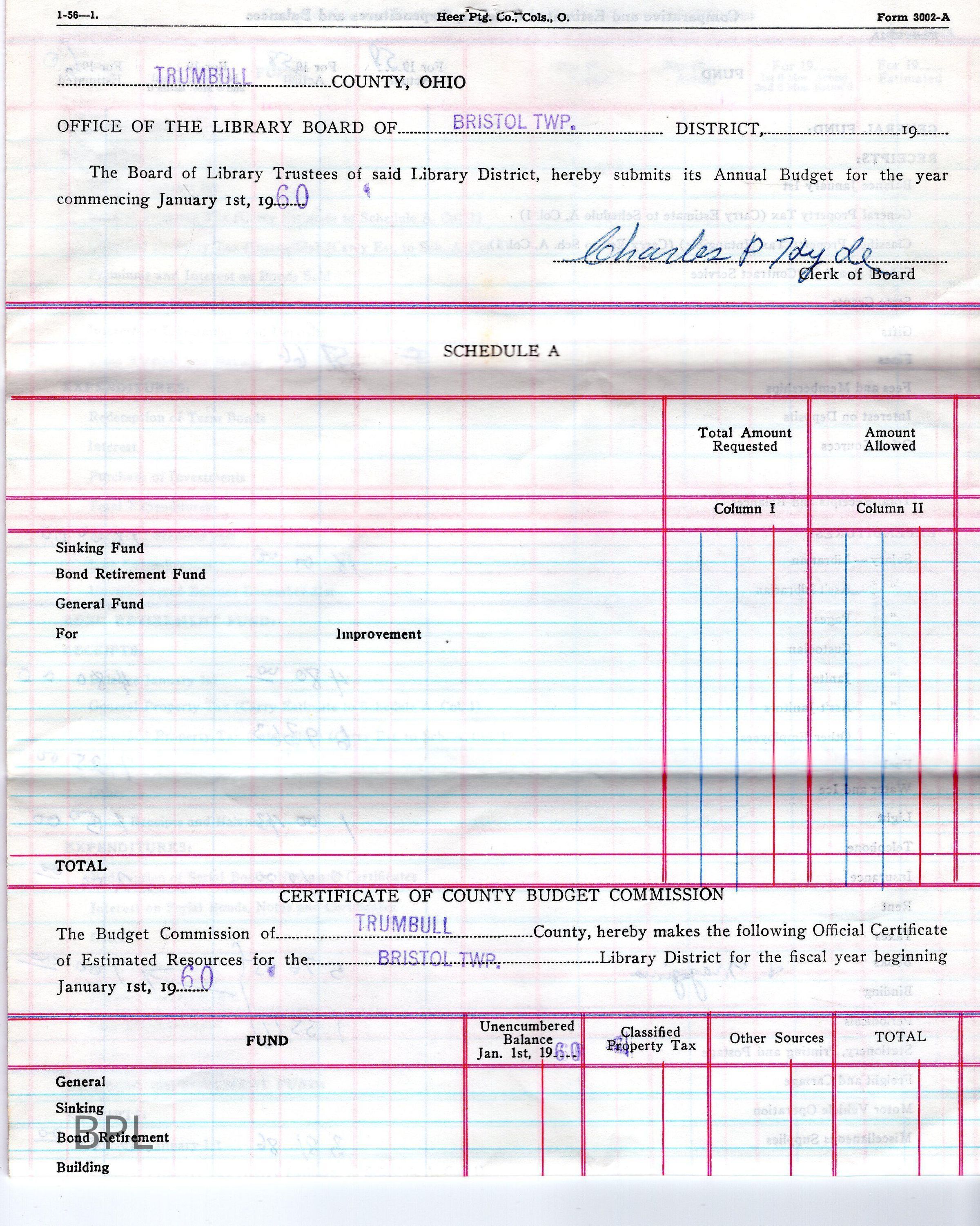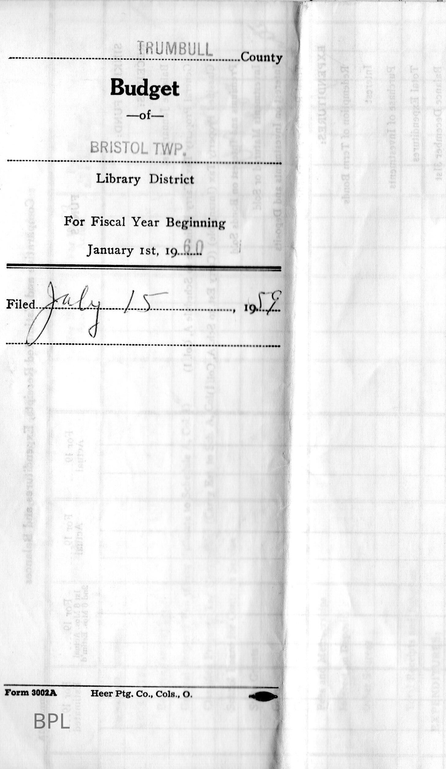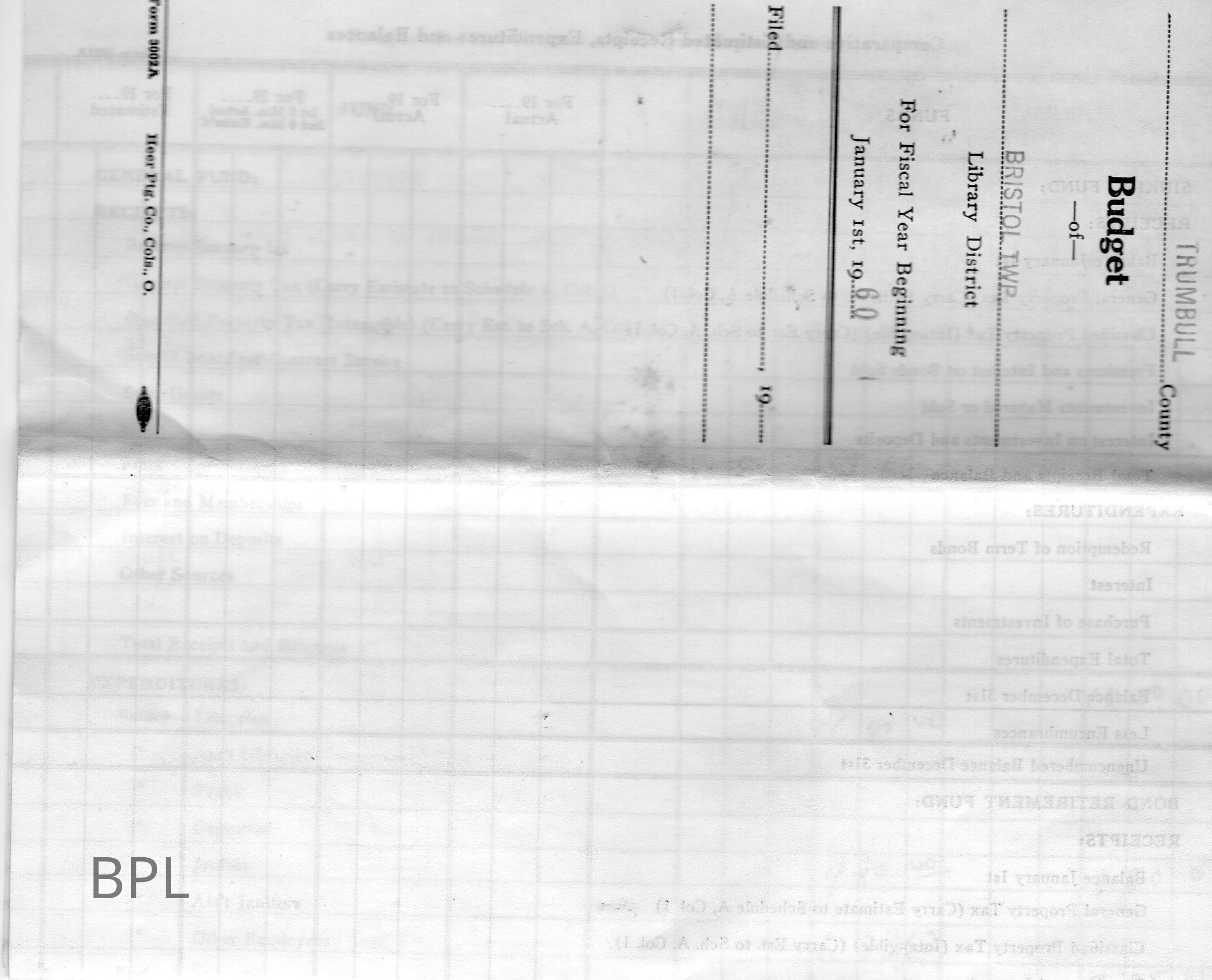 The annual budget of 1960 submitted to Trumbull County, Ohio for Bristol LibraryCataloged By