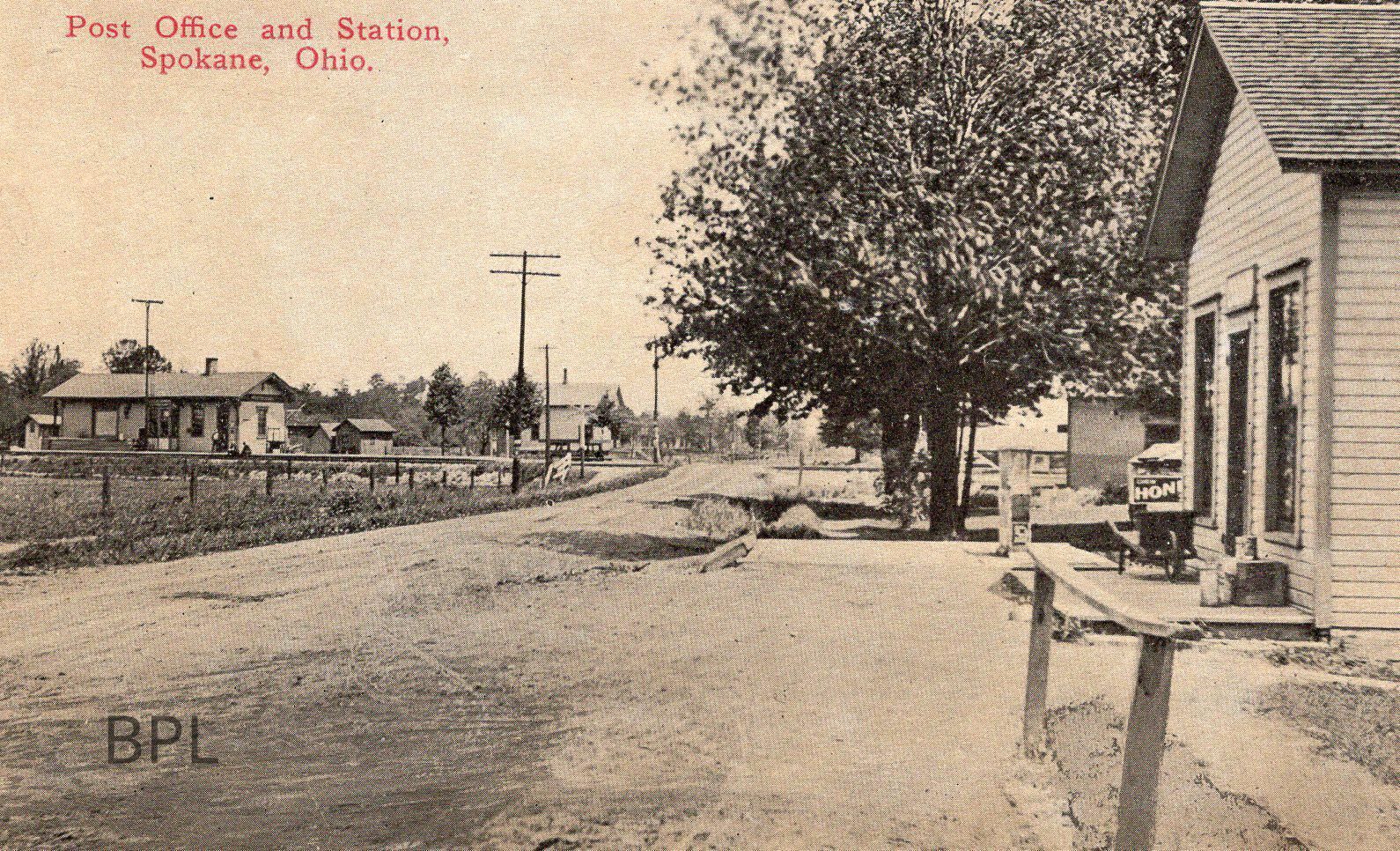 Postcard photo Spokane, Ohio, post office and to the left Pennsylvania Railroad station depot, Spokane is now Bristolville, OhioCataloged By