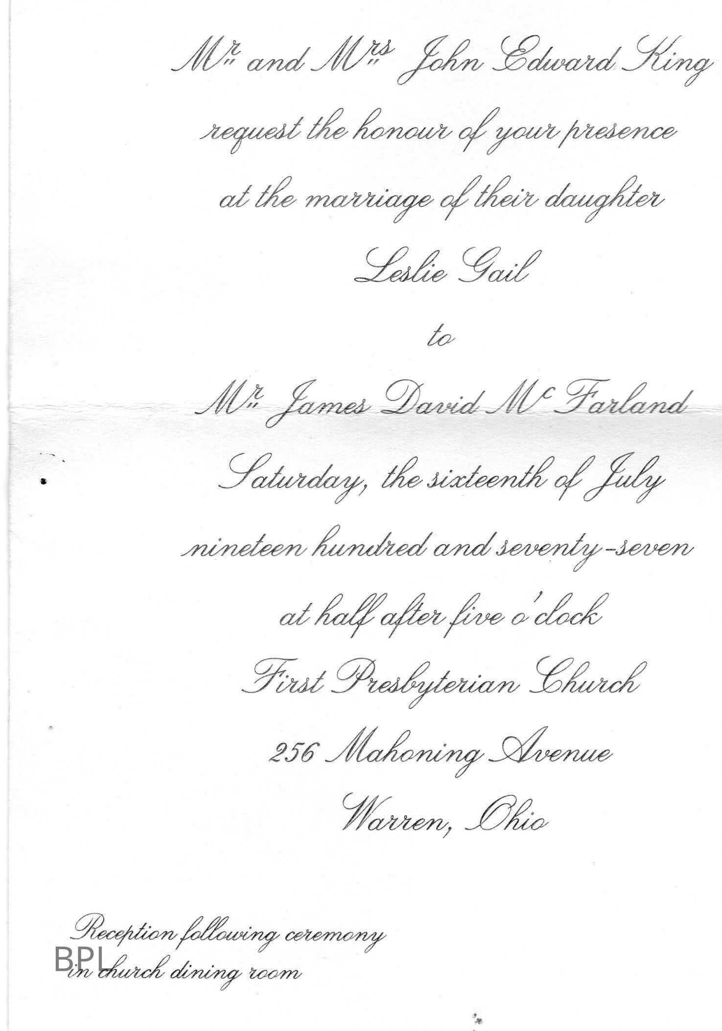 Wedding invitation for Leslie Gail King to James David McFarland,1977Cataloged By