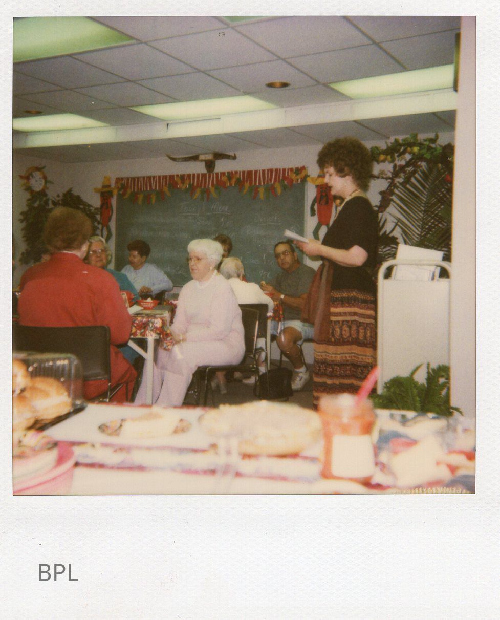 Photo, 2002, Bristol Public Library Cafe'. Standing, Angie Gabrielson.Cataloged By