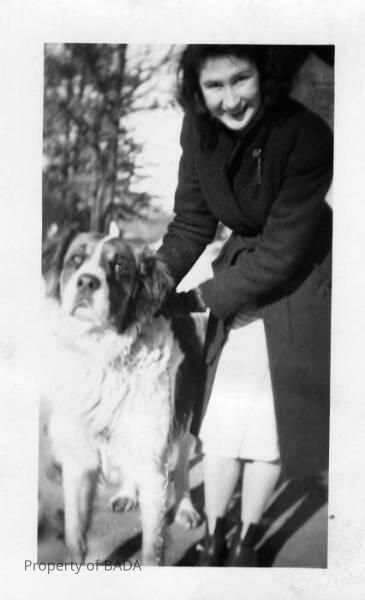 Fanchon as young woman in winter coat with large dog