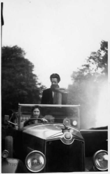 Fanchon driving classic vintage car with unidentified man