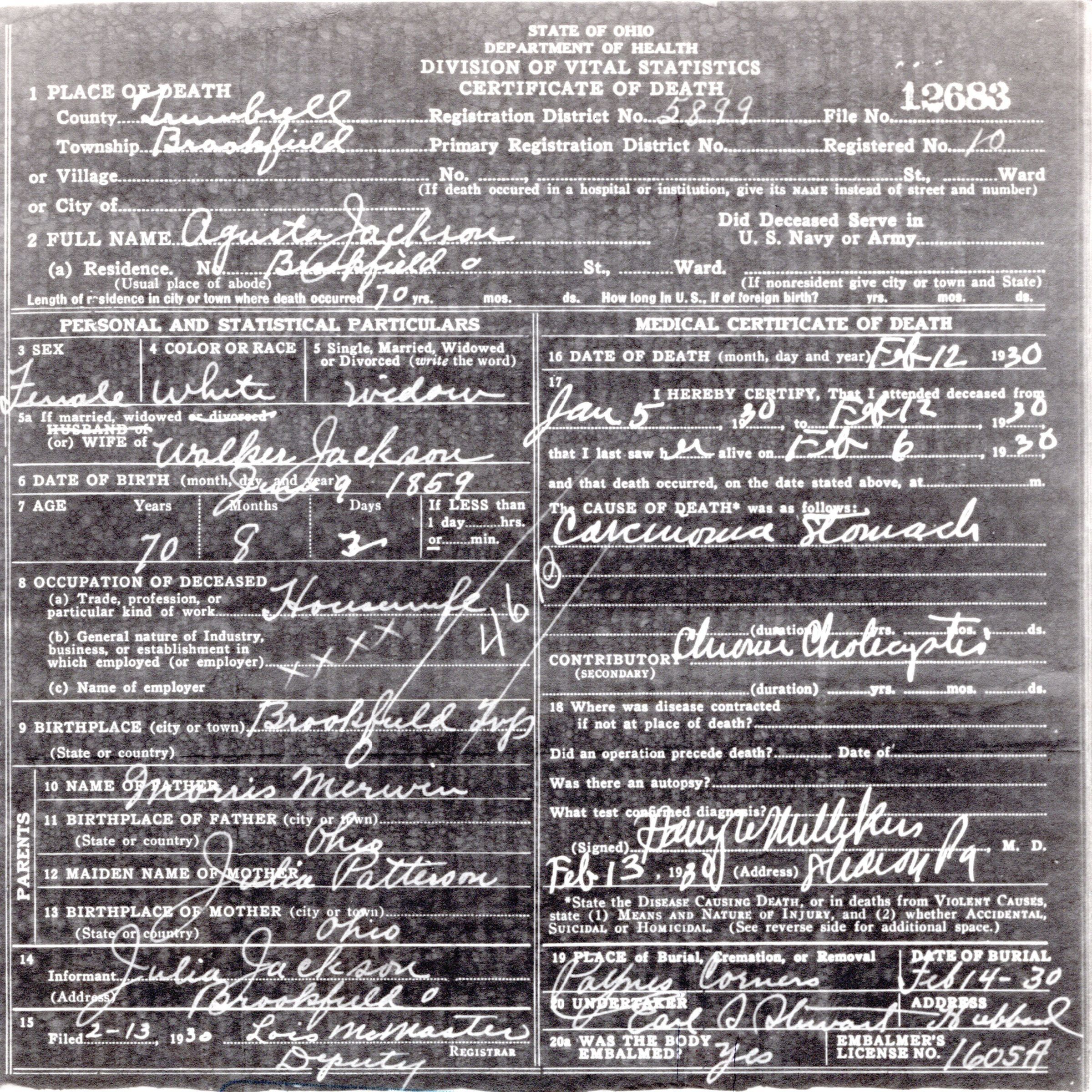 Death Certificate for Augusta Jackson, February 12, 1930.