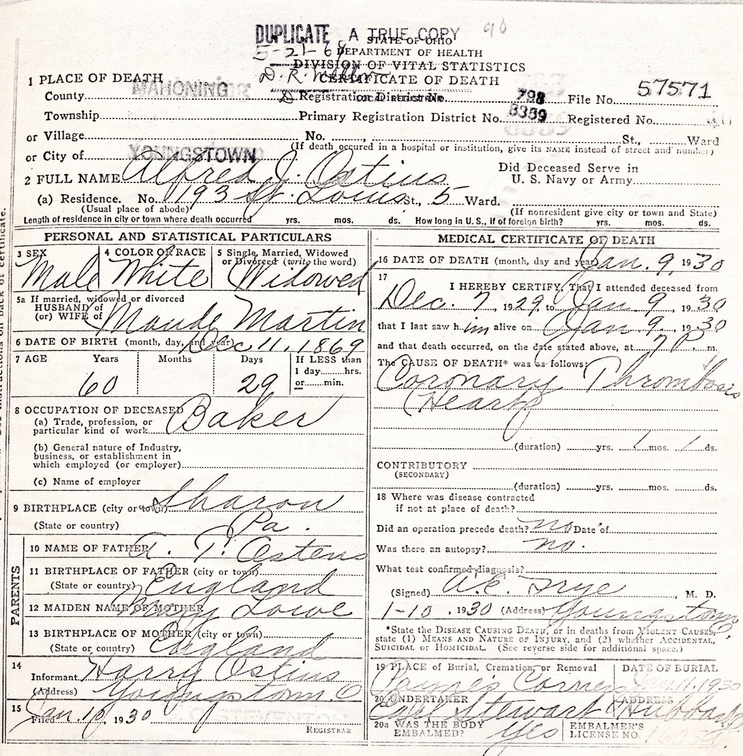 Death Certificate for Alfred J. Ostins, 1930