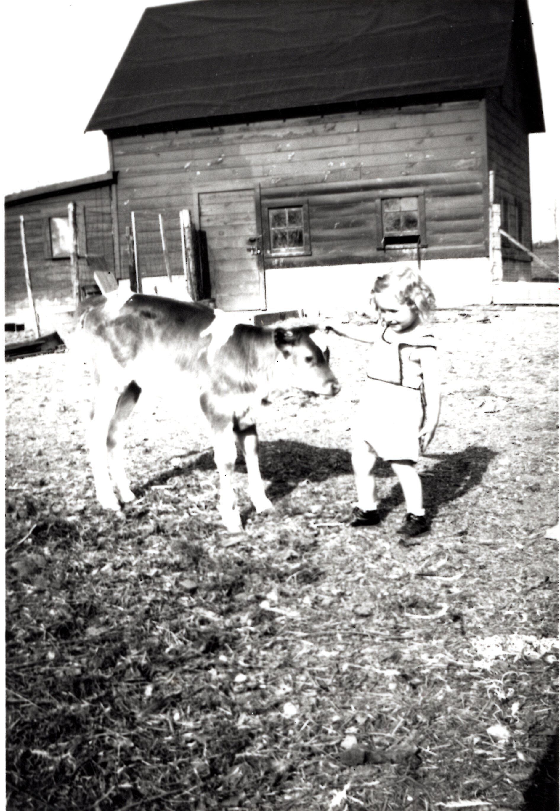 A photo of Betty Obermiyer (Detelich) at home on Obermiyer Road with a calf.
