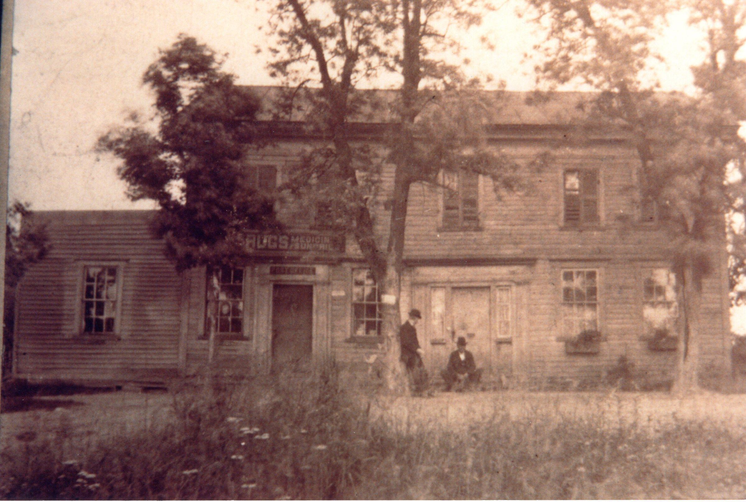 Photo of the Captain James Christy building in the 1870s. It housed a drug store and rooms for travelers and the carriage trade. The room on the north end which housed a post office. The building was constructed in 1816.