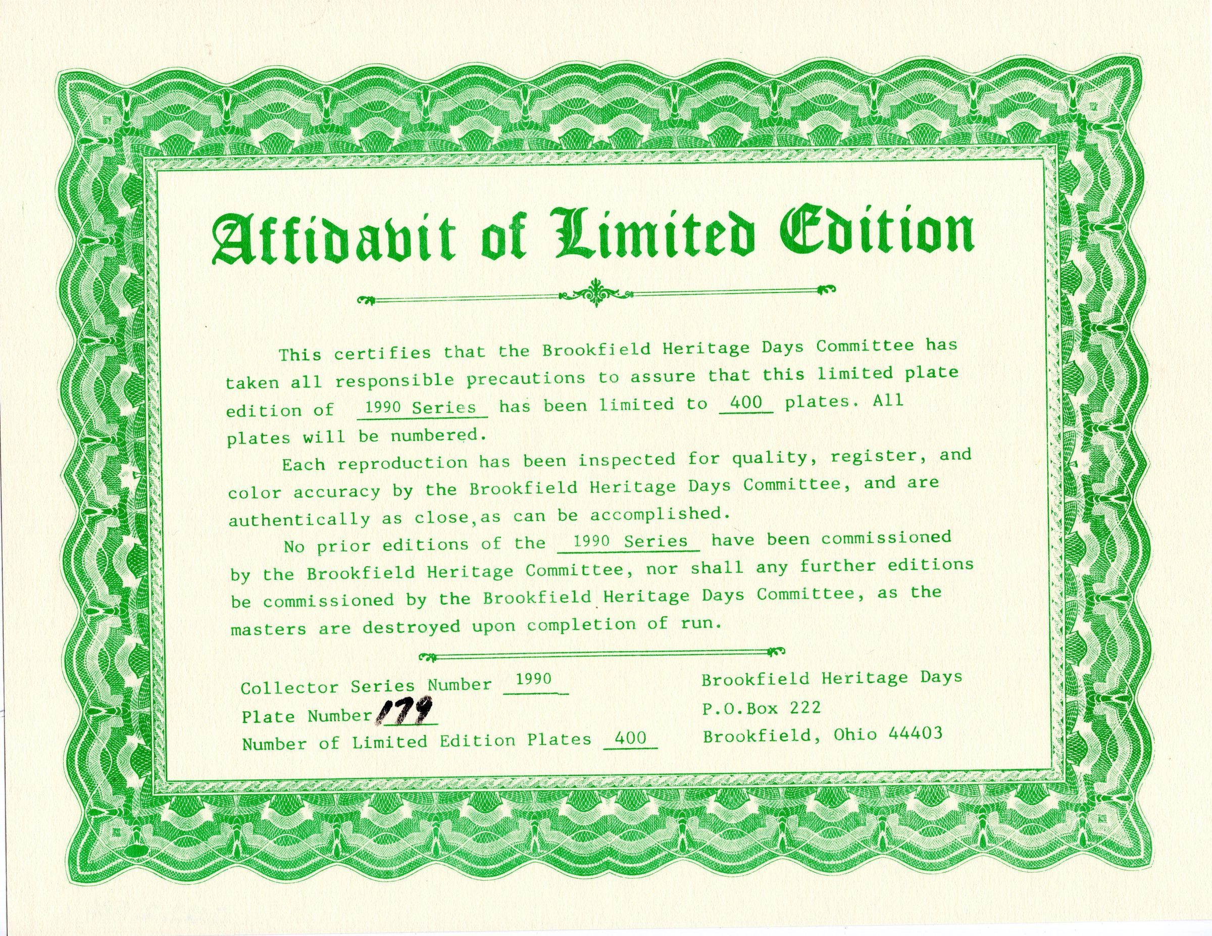 Affidavit of limited edition plate commemorating Brookfield Heritage Days of 1990.