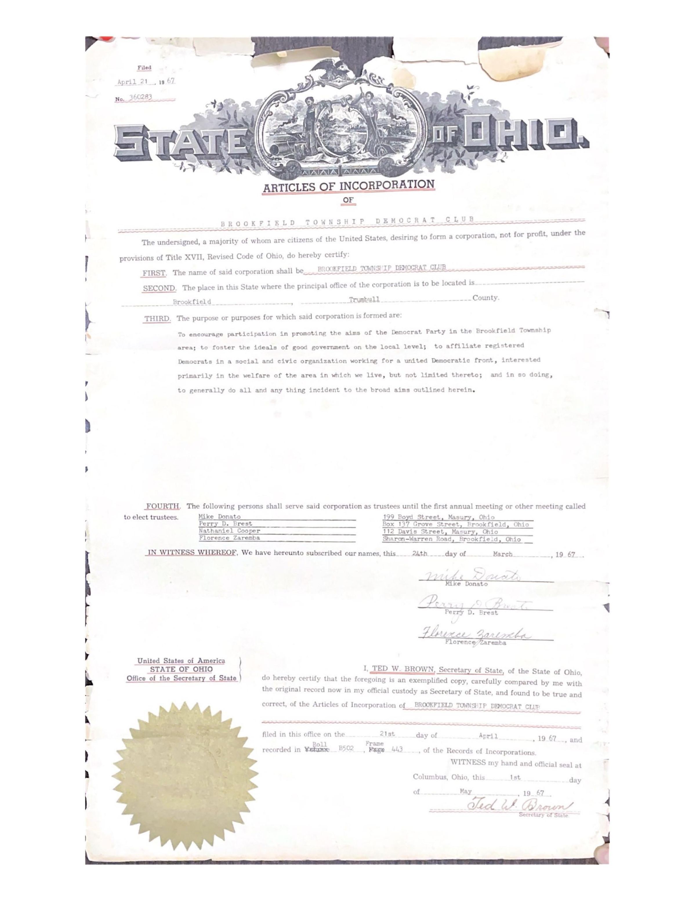 Article of incorporation of the Brookfield Township Democrat Club. April 21, 1967