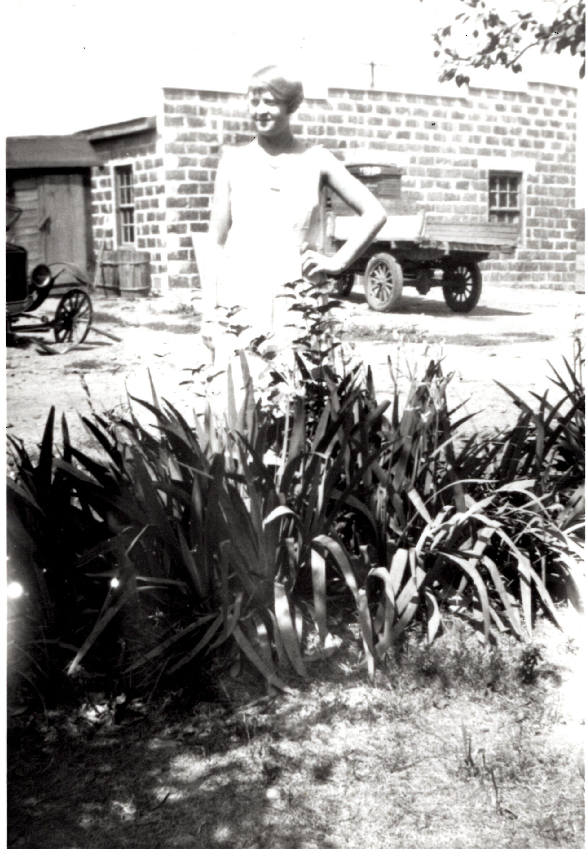 A photo of Aunt Ann Obermiyer (Faller) and Grandpa's truck in the drive at Obermiyer apartment. Uncle Steve Obermiyer's Gulf gas station/garage in background.