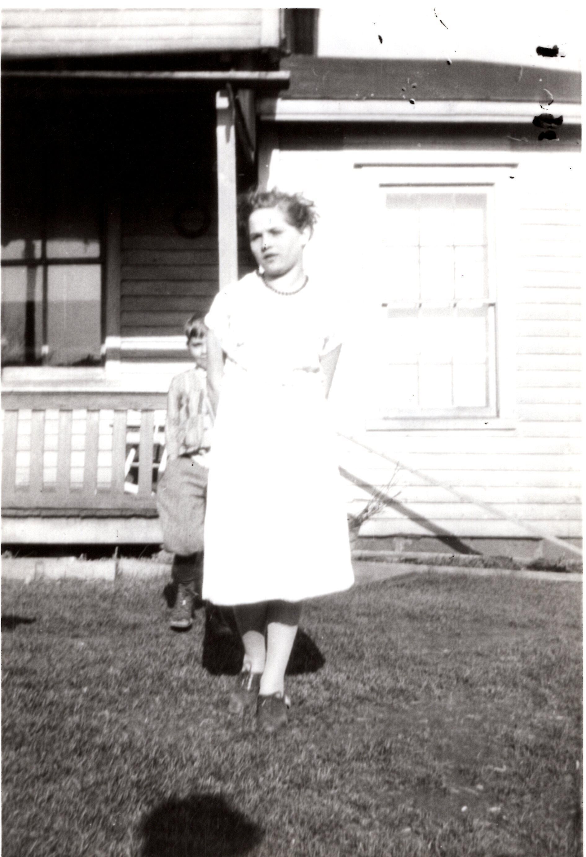 A photo of Aunt Mary Obermiyer (Roman) in the backyard of the Obermiyer building when she graduated from the 8th grade and Uncle Frank behind her.