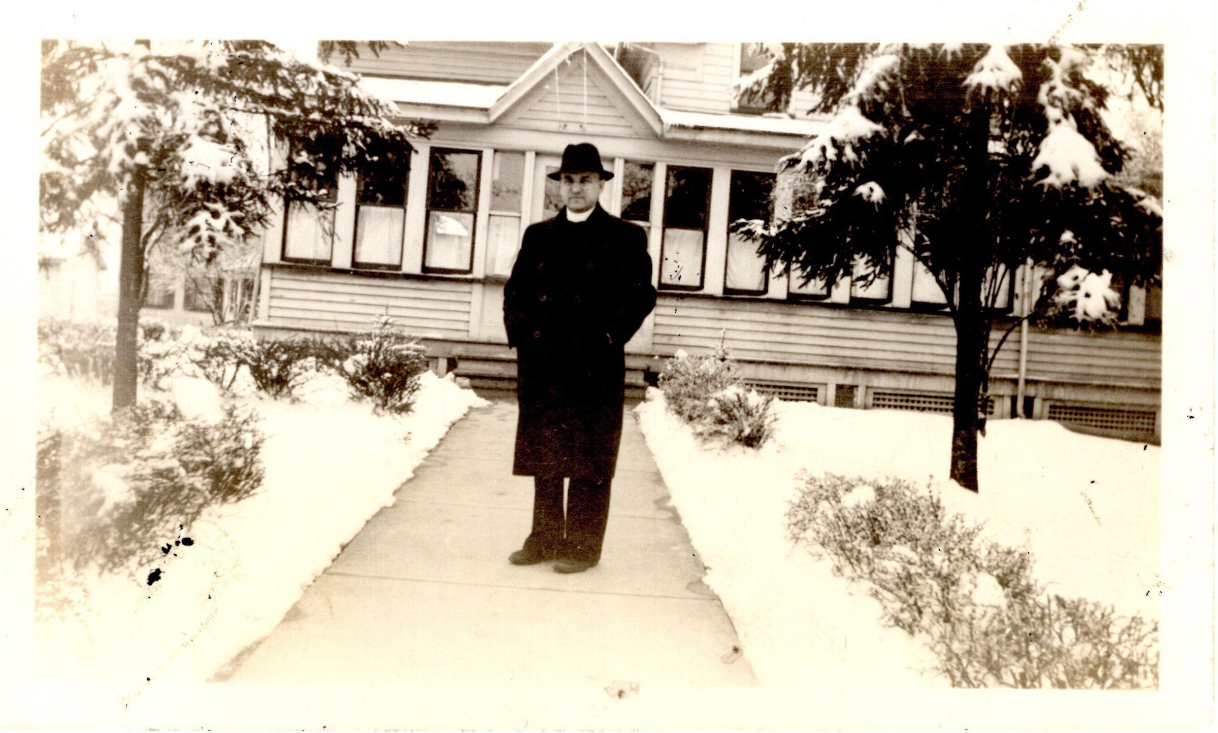 Photo of Father Bresznak outside of a house.