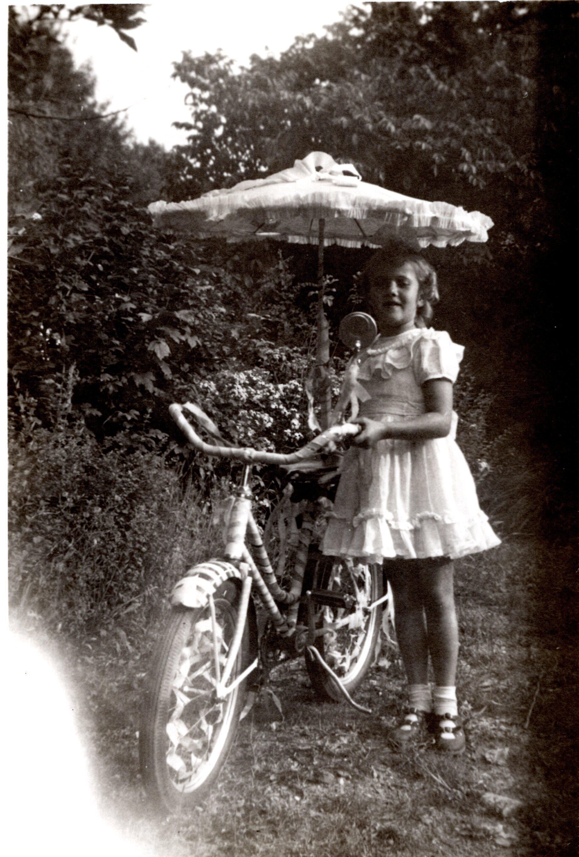 Photo of Betty Obermiyer (Detelich) with decorated bicycle at Brookfield's first Homecoming in 1949.