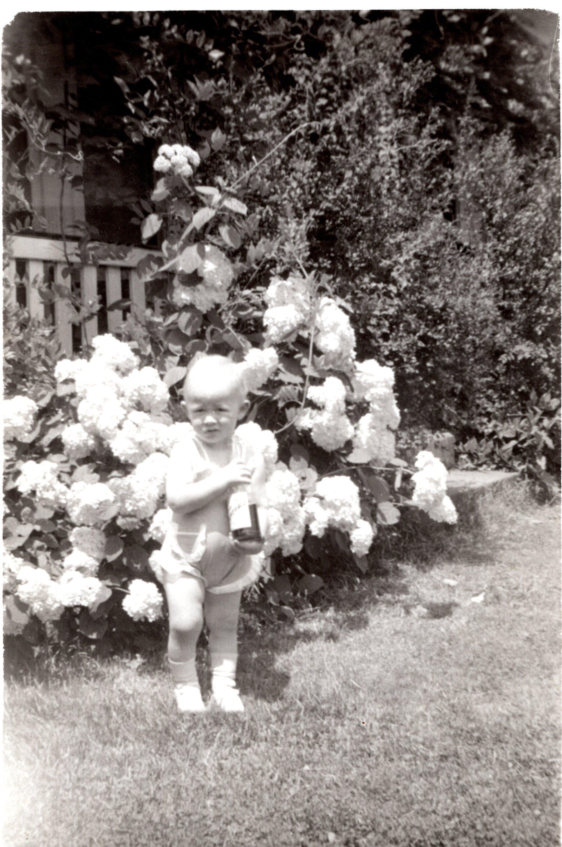 Photo of Bobby Faller standing in the backyard outside the Obermiyer apartment by Grandma Obermiyer's flowers.